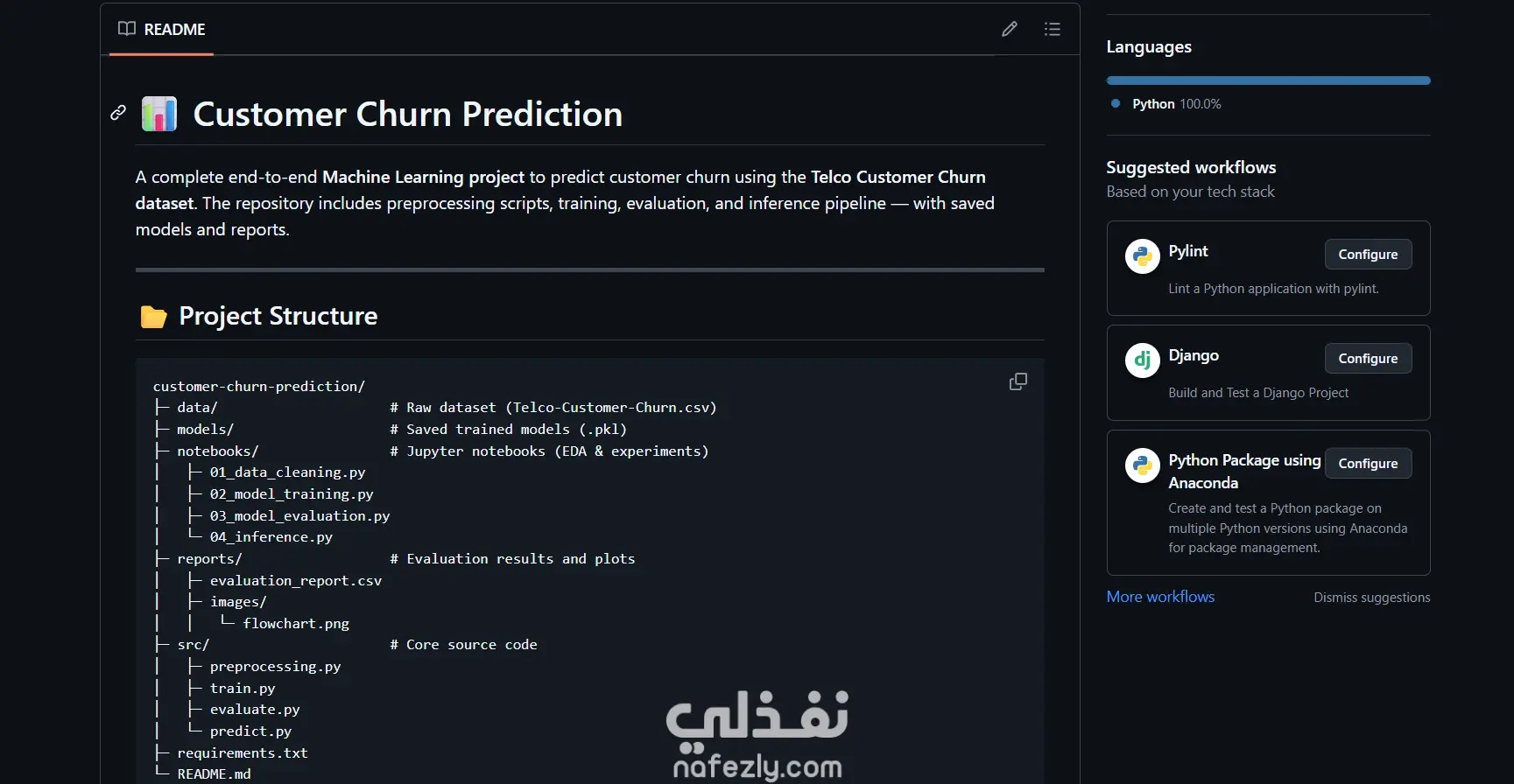 مشروع متكامل (End-to-End) في تعلم الآلة يهدف إلى التنبؤ باحتمالية "تسرب" العملاء (توقفهم عن استخدام الخدمة) بناءً على بياناتهم التاريخية. مر المشروع بعدة مراحل رئيسية: معالجة البيانات (Preprocessing): تنظيف البيانات الأولية ومعالجتها لتكون جاهزة للتحليل. التحليل الاستكشافي (EDA): استخدام (Jupyter Notebooks) لاستكشاف البيانات وفهم الأنماط والعلاقات بين المتغيرات. بناء النماذج (Training): تدريب عدة نماذج تعلم آلة (مثل Logistic Regression, Random Forest) على البيانات. التقييم (Evaluation): تقييم أداء النماذج باستخدام مقاييس دقيقة (مثل Confusion Matrix, ROC Curve, Classification Report) لاختيار النموذج الأفضل. بناء نظام التنبؤ (Inference): تجهيز (Pipeline) كامل يمكنه استقبال بيانات عميل جديد والتنبؤ بسلوكه. الأدوات المستخدمة: Python Pandas: لمعالجة وتحليل البيانات. Scikit-learn (sklearn): لبناء النماذج وتقييمها. Jupyter Notebooks: للتحليل الاستكشافي وتوثيق الخطوات. هذا المشروع يبرز قدرتي على بناء حلول تحليلية كاملة، بدءاً من البيانات الخام وصولاً إلى نموذج تنبؤي جاهز للاستخدام."
