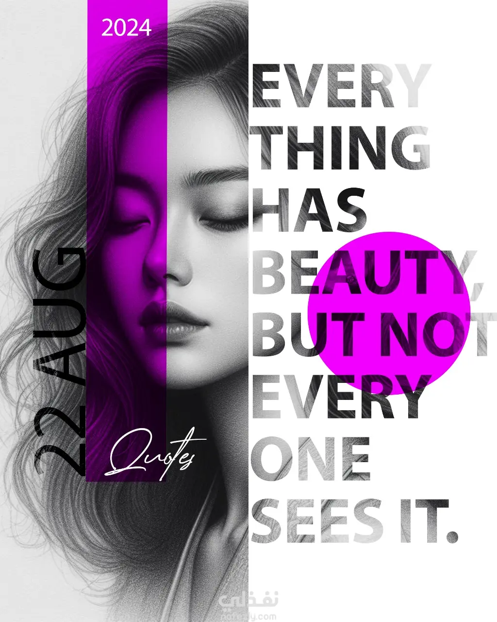 تصميم بوستر فني مميز يعتمد على تقنية Split Layout التي تقسم الوجه بين الأبيض والأسود وبين تدرجات الوردي النيون. التركيز الأساسي على الاقتباس الكتابي الذي يظهر بخط عصري ووضوح عالي، مع انسجام جميل بين الصورة والفكرة. التصميم مناسب لمحتوى السوشيال ميديا، صفحات الاقتباسات، أو كعمل فني معلق.