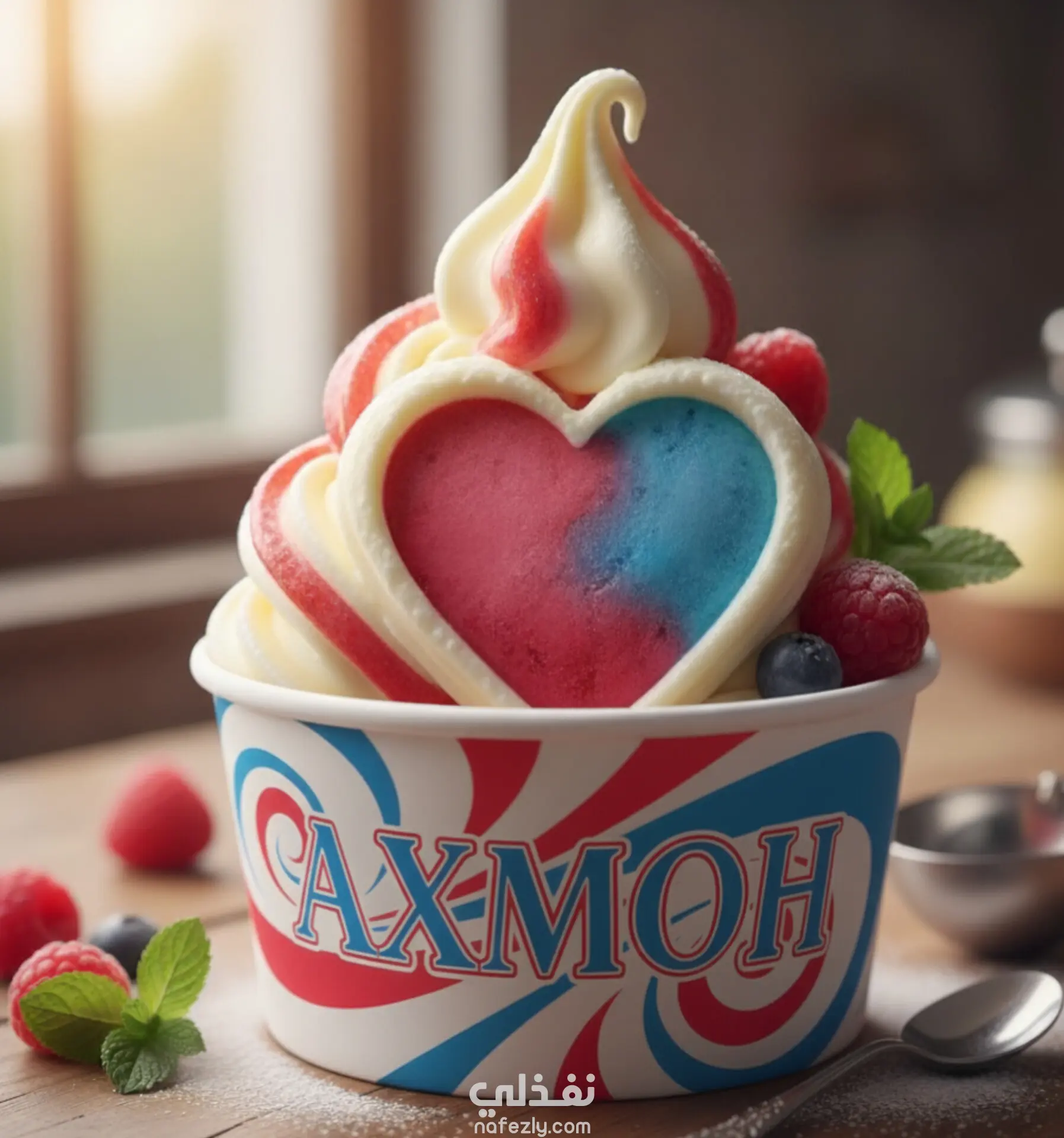 الصورة تظهر كوب آيس كريم ملون بطريقة جذابة، حيث يوجد مزيج من الألوان الأبيض، الأحمر والأزرق بشكل حلزوني، بالإضافة إلى قطعة على شكل قلب داخل الكوب بنفس الألوان. حول الكوب توجد بعض حبات التوت والنعناع كزينة جانبية، وكل شيء موضوع على طاولة خشبية بديكور منزلي دافئ وخلفية ضبابية بسيطة.اسم المنتج الظاهر على الكوب هو "AXZMOH "، مكتوب بأحرف سريلية بارزة باللون الأزرق مع حدود حمراء، ويبدو أنه اسم علامة تجارية أو منتج متعلق بالآيس كريم المقدم في الصورة.