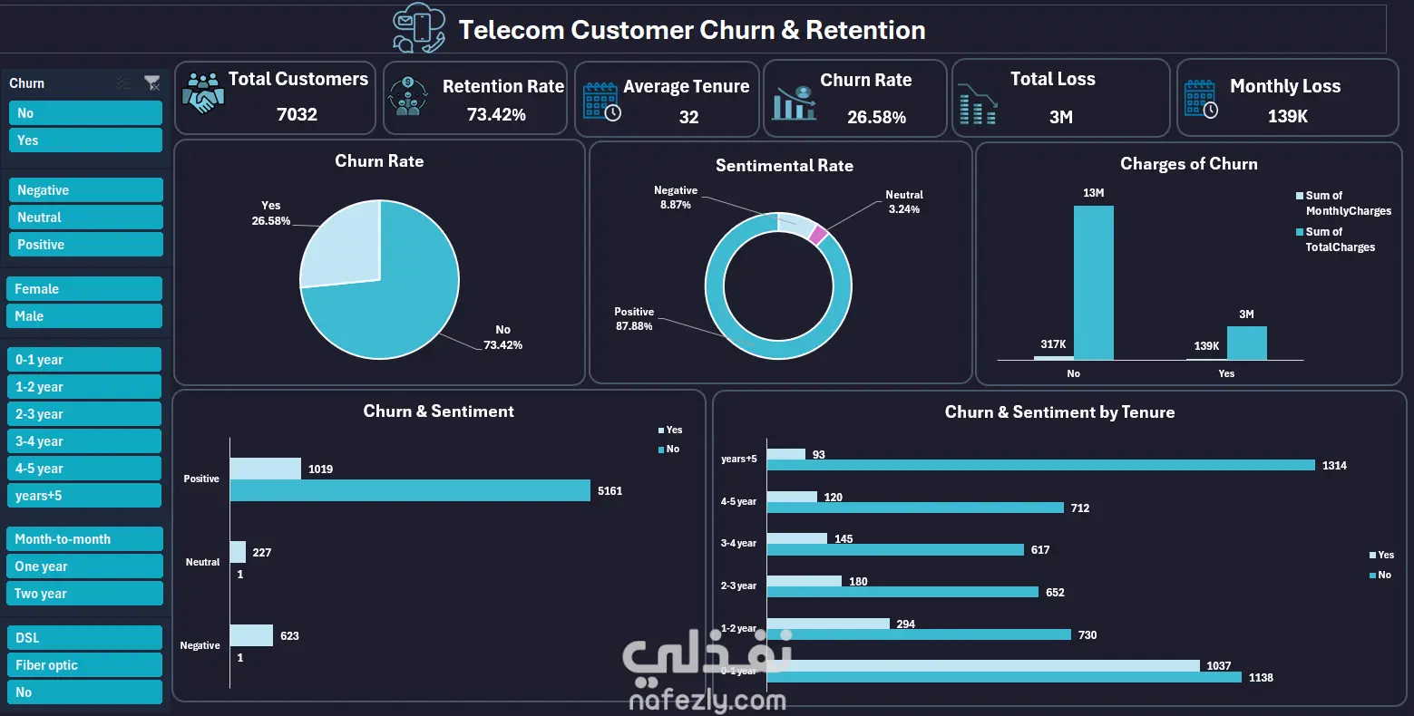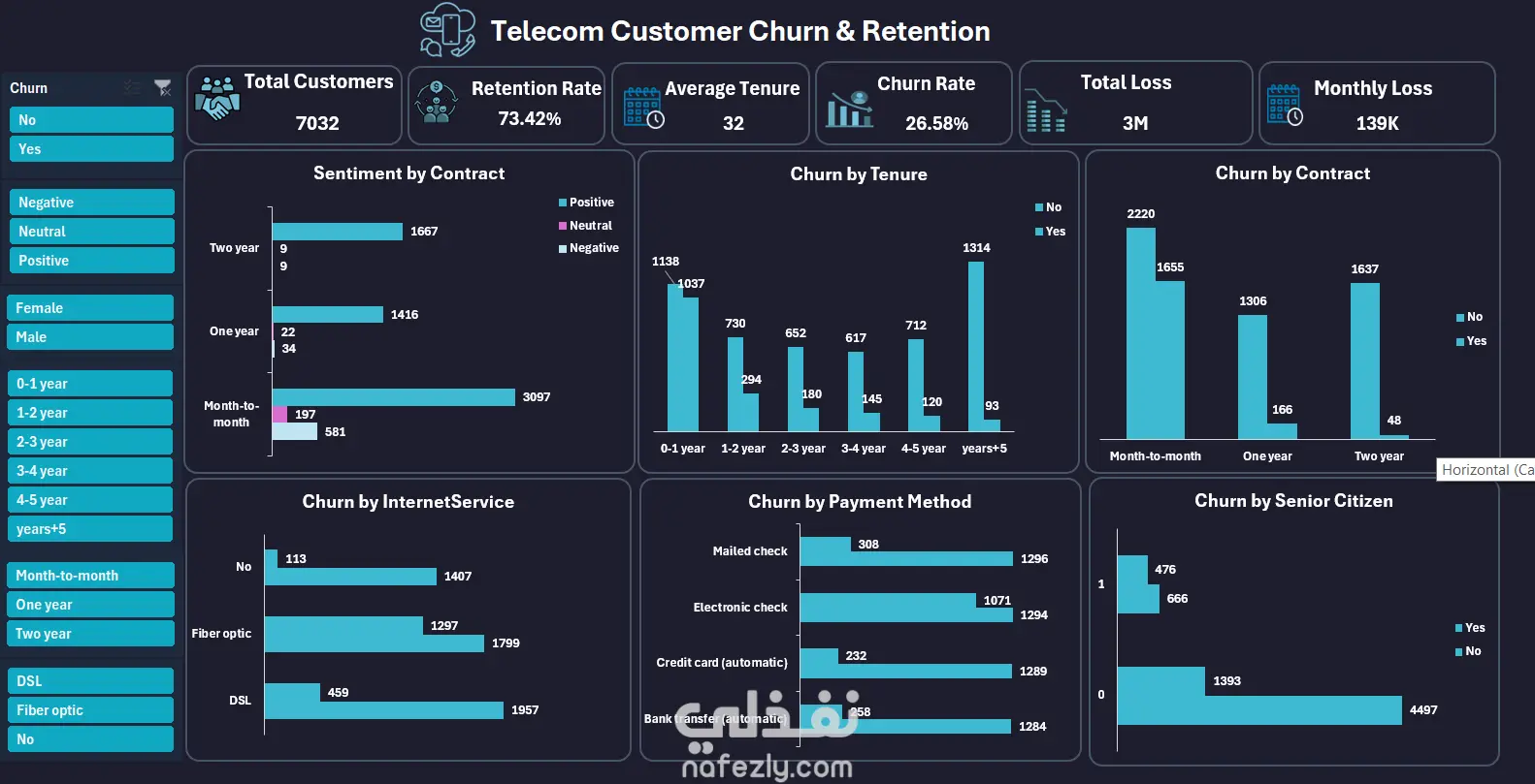 قمت بتطوير لوحة تحكم تفاعلية من صفحتين باستخدام Excel لتحليل معدل فقد العملاء (Customer Churn) في شركة اتصالات، بهدف توفير رؤية شاملة تساعد الإدارة في اتخاذ قرارات مبنية على البيانات وتحسين استراتيجيات الاحتفاظ بالعملاء. 📄 محتوى الداشبورد (Dashboard Content) الصفحة الأولى (Page 1): Churn Overview & Sentiment Analysis تتضمن: مؤشرات الأداء الرئيسية (KPIs): Total Customers Retention Rate Average Tenure Churn Rate Total Loss Monthly Loss تحليل شامل للـ Churn Rate تحليل المشاعر (Sentiment Analysis) بين Positive / Neutral / Negative مقارنة بين Churn و Sentiment تحليل Churn & Sentiment حسب مدة الاشتراك (Tenure) فلاتر تفاعلية (Slicers) لتسهيل استكشاف البيانات: Churn Gender Sentiment Tenure Groups Contract Internet Service الصفحة الثانية (Page 2): Deep Dive Analysis تتضمن: Sentiment by Contract Churn by Tenure Churn by Contract Churn by Internet Service Churn by Payment Method Churn by Senior Citizen فلاتر كاملة لتمكين التحليل حسب أي متغير موجود في البيانات أهم مميزات المشروع تصميم احترافي من صفحتين واضح وسهل القراءة تفاعلية تامة باستخدام Slicers و PivotCharts إمكانية تحليل سلوك العملاء من عدة زوايا استخراج Insights مباشرة بدون مجهود 🛠️ الأدوات المستخدمة Microsoft Excel Pivot Tables Pivot Charts Slicers Data Cleaning & Preparation Data Visualization Techniques