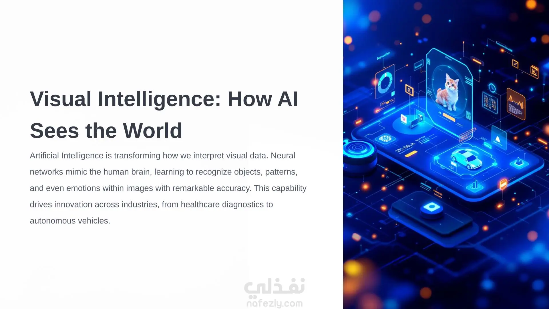 عرض PowerPoint بيشرح الـ CNNs بطريقة سهلة وواضحة وجذابة. بيغطي أساسيات الشبكات العصبية، وطريقة عمل كل طبقة في الـ CNN زي Convolution و ReLU و Pooling و Fully Connected، وكمان بيشرح عملية التعلم، مجموعات البيانات الشهيرة، مكتبات Python، وتطبيقاتها العملية في الرؤية الحاسوبية وفي البيزنس، وكمان بيعرض المميزات والتحديات وشرائح التلخيص. كل شريحة تحتوي على رسومات ومخططات وإنفوجرافيكس بشكل احترافي.