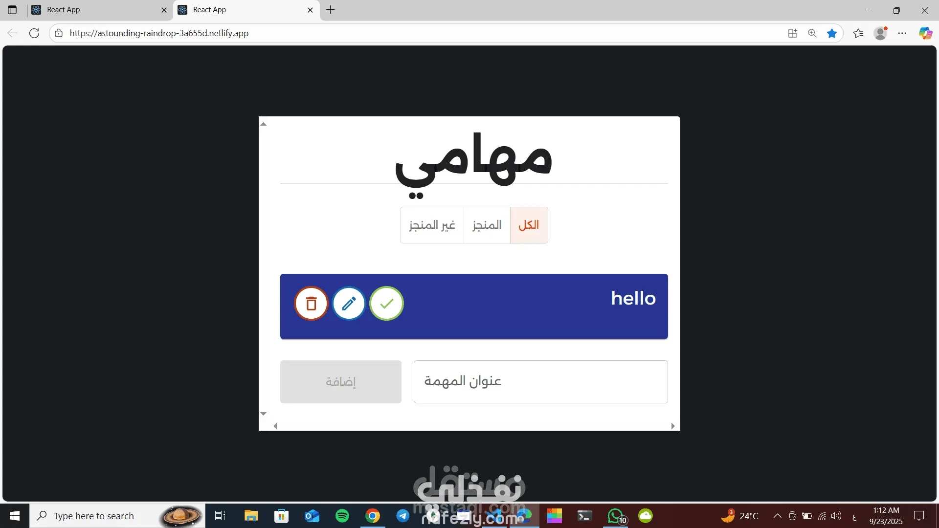 تطبيق ويب بسيط لإدارة المهام اليومية (To-Do List) يساعد المستخدم على إضافة، تعديل، وحذف المهام بسهولة، مع واجهة عربية حديثة وسهلة الاستخدام.