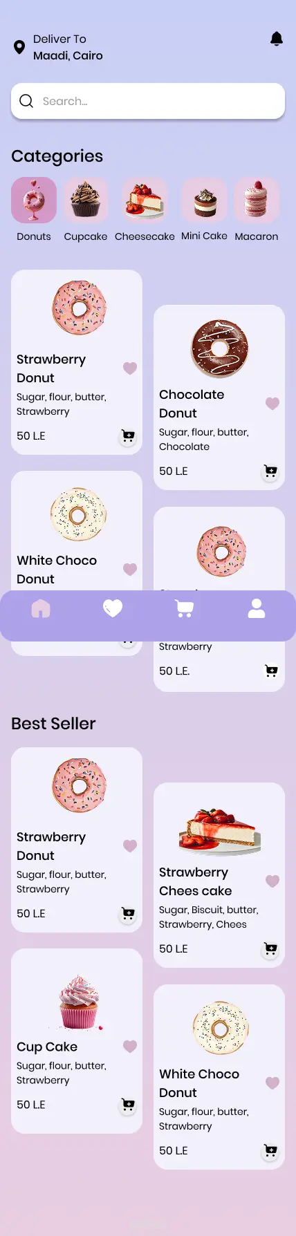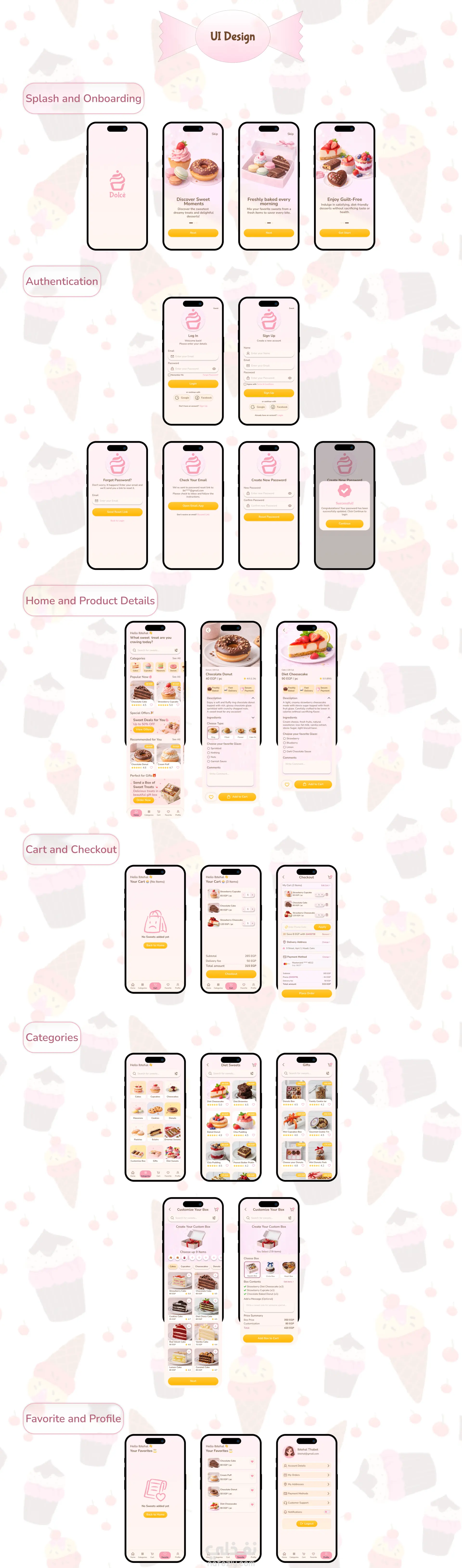 واجهة تطبيق متخصص في شراء الحلوى يوفر تجربة تسوّق سلسة وممتعة للمستخدمين. ركّزت في التصميم على إبراز جمال المنتجات بنمط بصري جذّاب وألوان دافئة تعكس طابع الحلويات وتمنح المستخدم شعورًا بالمتعة والراحة أثناء التصفح. يشمل التصميم: واجهة رئيسية تعرض أشهر الحلوى والعروض المميزة. تصنيف واضح للأنواع (كب كيك، دونات، ماكرون… إلخ). صفحة منتج تفصيلية تعرض الصور، السعر، المكونات، والمراجعات. سلة مشتريات سهلة الاستخدام تدعم إضافة وتعديل الكميات. تجربة دفع مبسّطة تشجّع المستخدم على إكمال الطلب بسرعة. تصميم انسيابي، متجاوب، ومبني على مبادئ الـUI/UX لتحسين الاستخدام وزيادة المبيعات. هذا المشروع يعكس خبرتي في تصميم تطبيقات التجارة الإلكترونية وتقديم تجربة مرئية جذّابة تساعد العلامات التجارية على البيع بشكل أفضل.