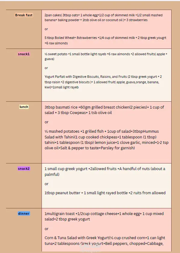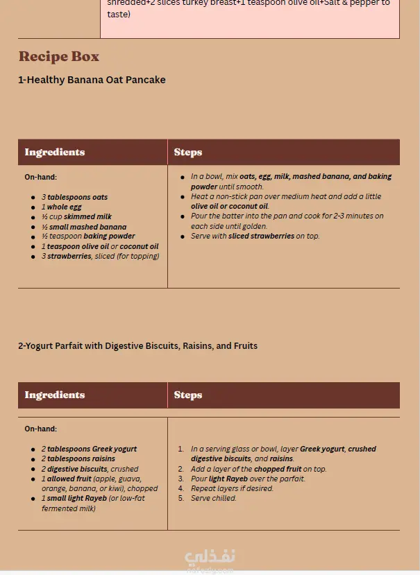 كتيب تغذوي مصغر مكوّن من ثلاث صفحات مصممة بعناية لتقديم خطة غذائية يومية متوازنة، وصفات صحية سهلة التحضير، وغلاف تحفيزي منظم. العمل يهدف إلى تسهيل الالتزام بالعادات الغذائية الصحية من خلال تنظيم بصري جذاب، توزيع زمني للوجبات، واختيارات متنوعة تناسب احتياجات السعرات الحرارية . يشمل الكتيب وصفات مثل بان كيك الشوفان بالموز، وبارفيه الزبادي بالفواكه والبسكويت، بالإضافة إلى جدول وجبات يومية بخيارات متعددة لكل وجبة.
