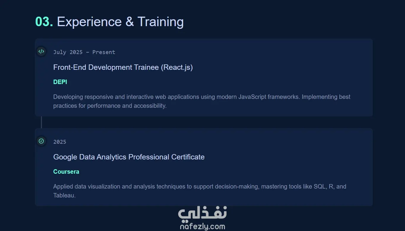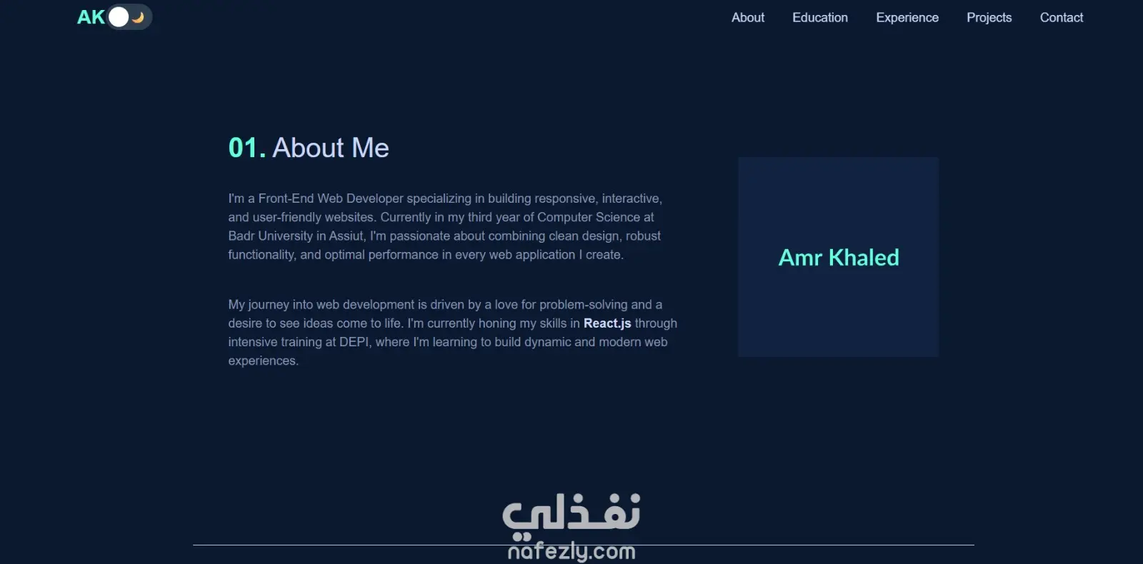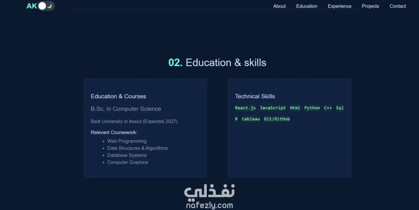 Project Description This is a simple personal portfolio website made up of five sections: About: A short introduction about myself. Education: A quick overview of my studies. Skills: The main skills I have. Experience: The projects and work I’ve done. Contact: A way for people to reach me. The website is clean and organized to show who I am and what I do in a simple way.