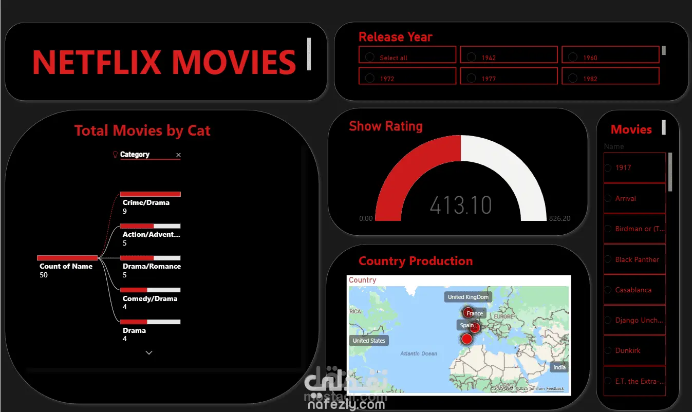 dashboard باستخدام ال Power Bi لتوضيح افلام قنوات الNetflex وانواعها اللتي تنحصر في دراما وكوميدي و رومانسي الخ ..... واعلي نسب مشاهده والدول المنتجه