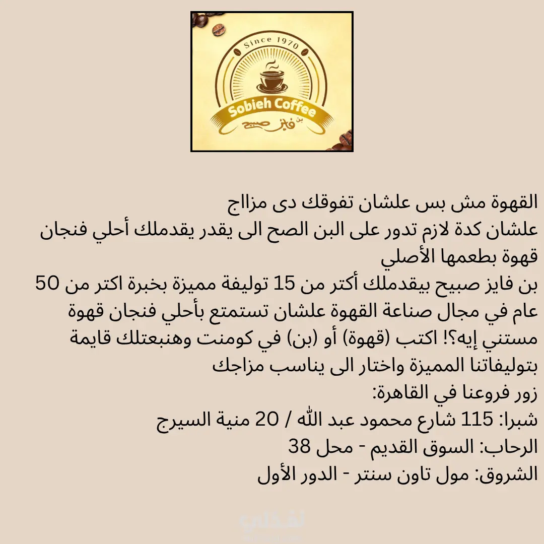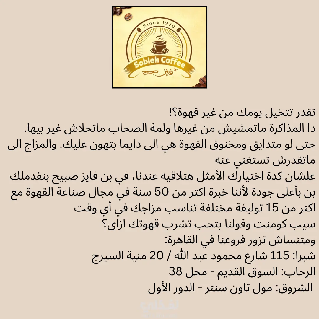 بن فايز صبيح يتميز بالجودة العالية مع خبرة اكثر من 50 عام في مجال صناعة القهوة مع اكتر من 15 توليفة مختلفة فى البداية بعد التحدث مع العميل بدات بتحليل صفحة الشركة ودراسة المنافسين لفهم وضع الشركة فى السوق ثم تم تحديد شرائح الجمهور المستهدف و على اساسه تم صياغة رسالة تسويقية مناسبة لاجتياجاته مع توضيح جودة المنتج و خبرة الشركة للمستهلك حيث قمت بكتابة المحتوى بطريقة ال AIDA model بعد ذلك قمت بعمل خطة محتوى لاستمرار التواجد على منصات السوشيال ميديا وبالتالى استمرار التفاعل.