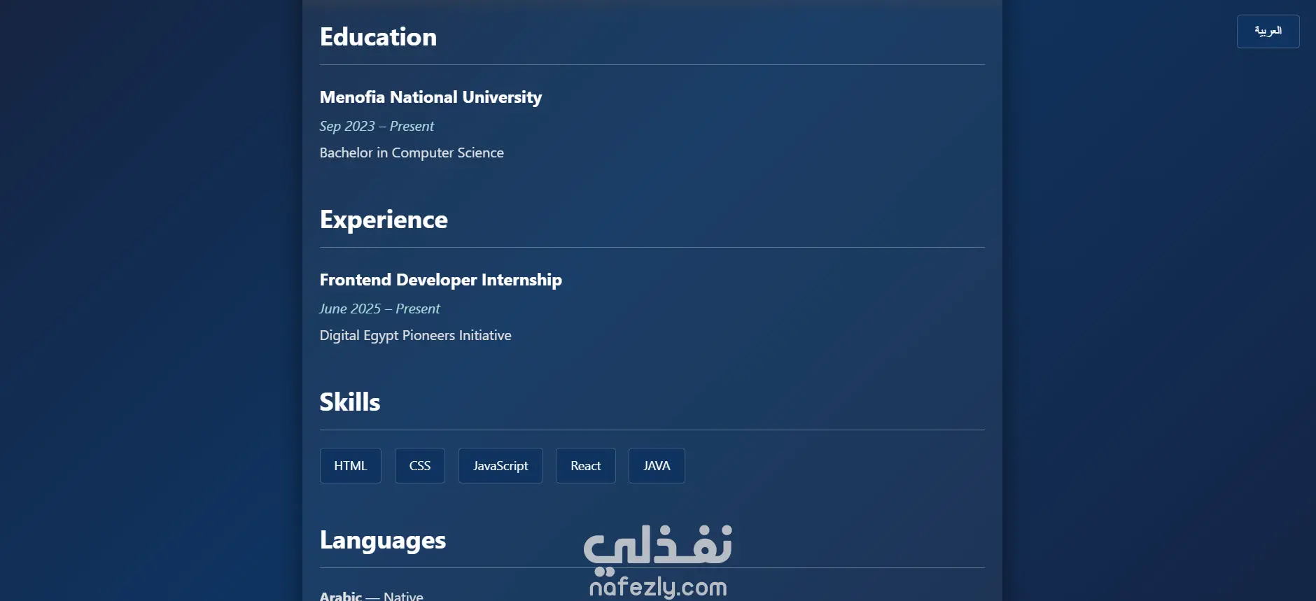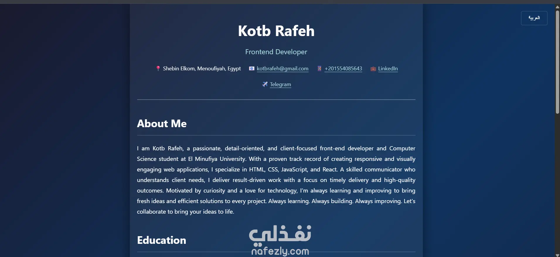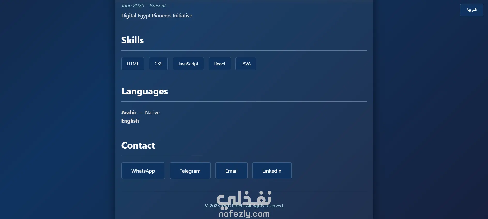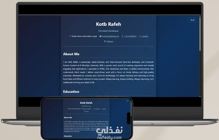سأقوم بإنشاء موقع Portfolio احترافي لعرض أعمالك ومهاراتك بطريقة جذابة ومنظمة. الموقع سيكون متجاوب مع جميع الأجهزة، سهل التصفح، ويعكس هويتك المهنية بطريقة أنيقة مع إمكانية إضافة معلومات التواصل وروابط الشبكات الاجتماعيةوسرعة تحميل ممتازة وتجربة مستخدم سلسة.