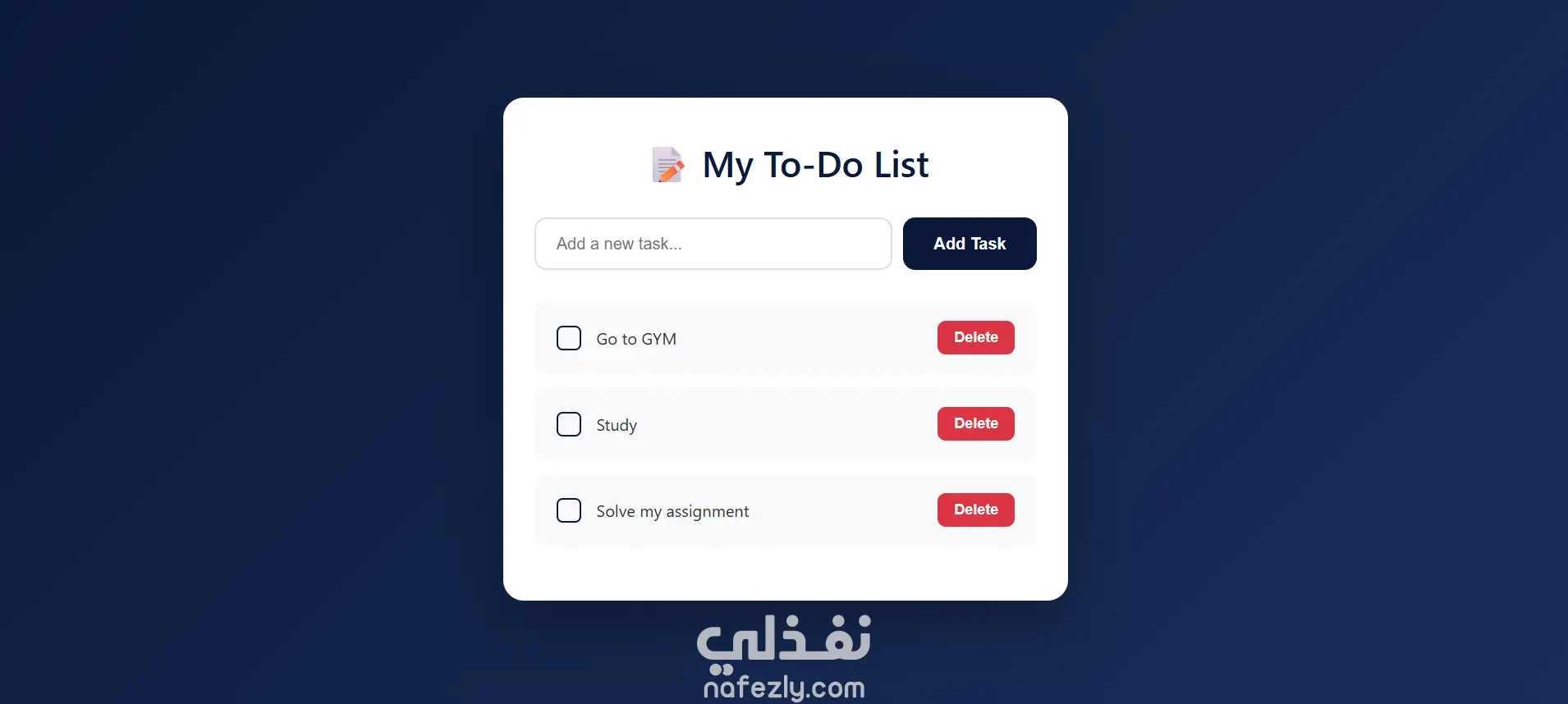 A clean and responsive To-Do List website built using HTML, CSS, and JavaScript. Features include task creation, deletion, completion tracking, and full localStorage support. Designed with a modern dark-blue theme and smooth animations. Technologies: HTML – CSS – JavaScript – LocalStorage