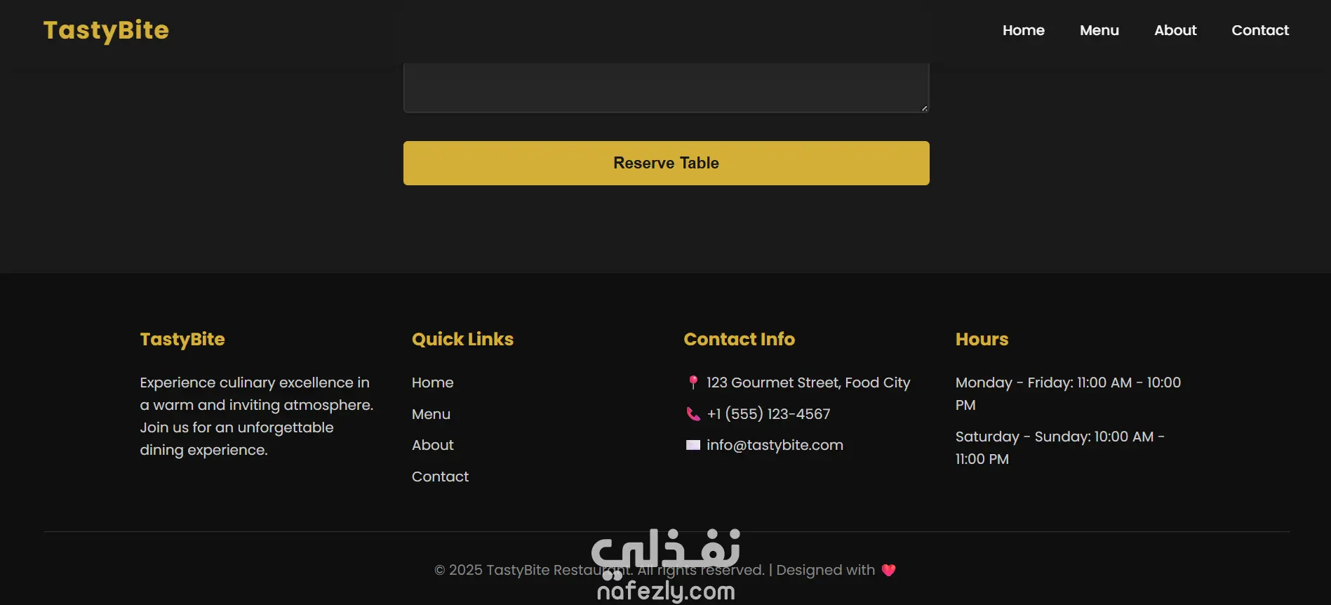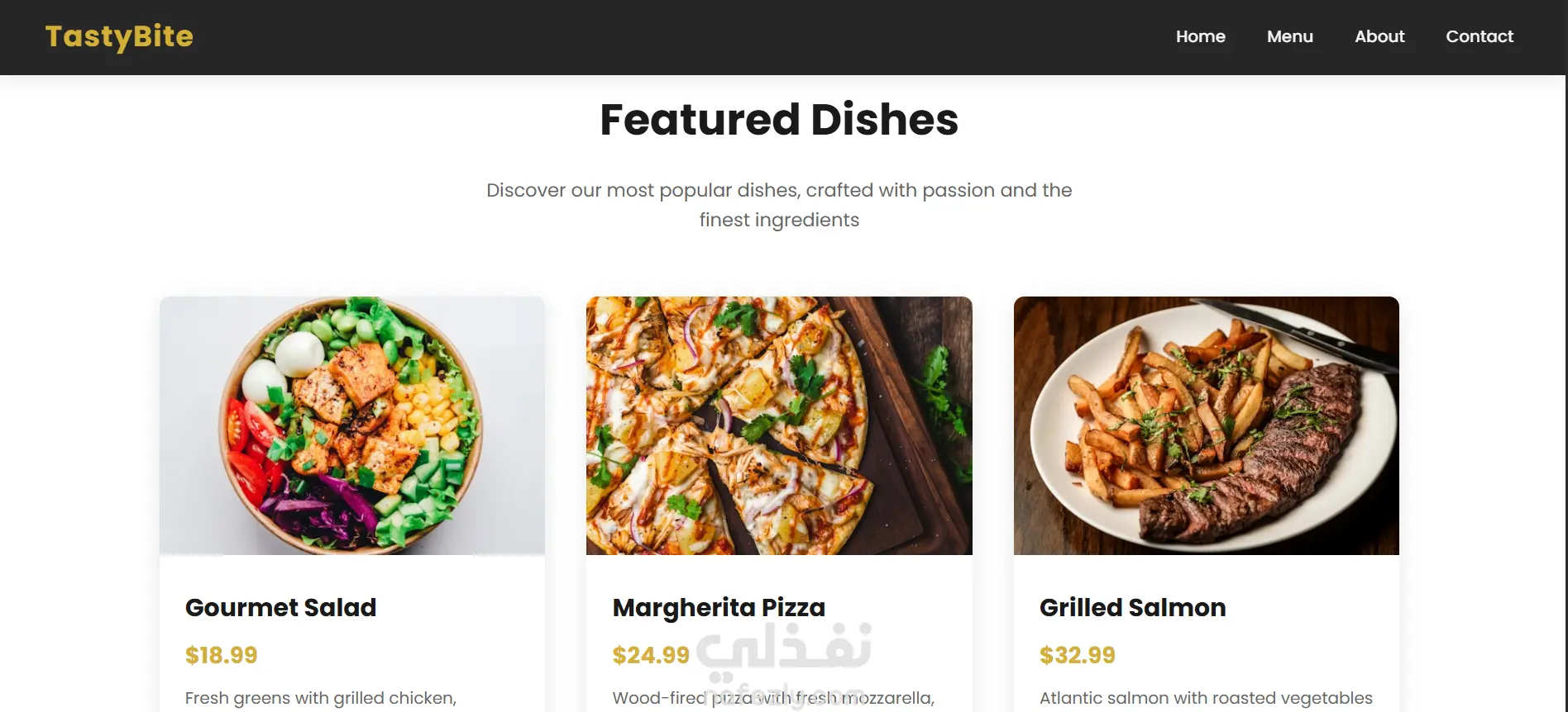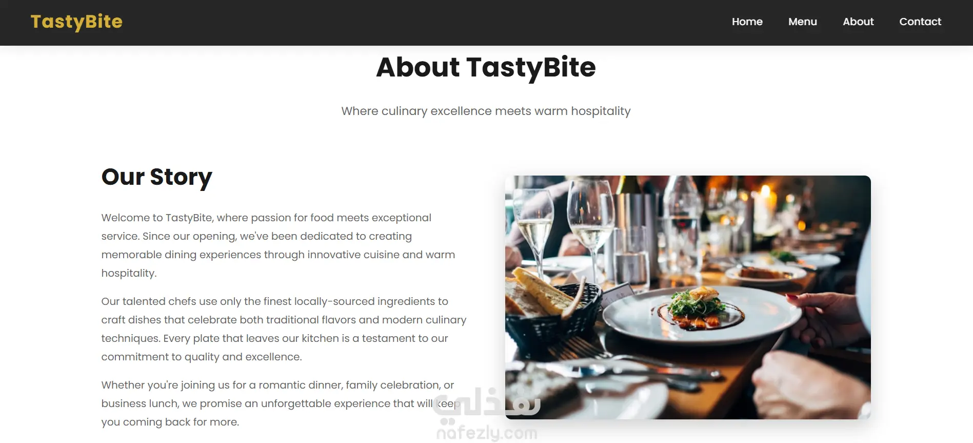 The restaurant webpage features a clean and visually appealing design that highlights the restaurant’s identity. At the top, there is a navigation bar with links to key sections like Menu, About, and Contact. The page includes a hero section with a welcoming message and a high-quality image of the restaurant. The Menu section showcases dishes with images and prices in a clear and organized layout. There’s also an About section with a brief introduction to the restaurant, and a Contact section with a contact form and social media links. The design is fully responsive, providing a smooth experience on all devices, with a color scheme and visuals that match the restaurant theme.