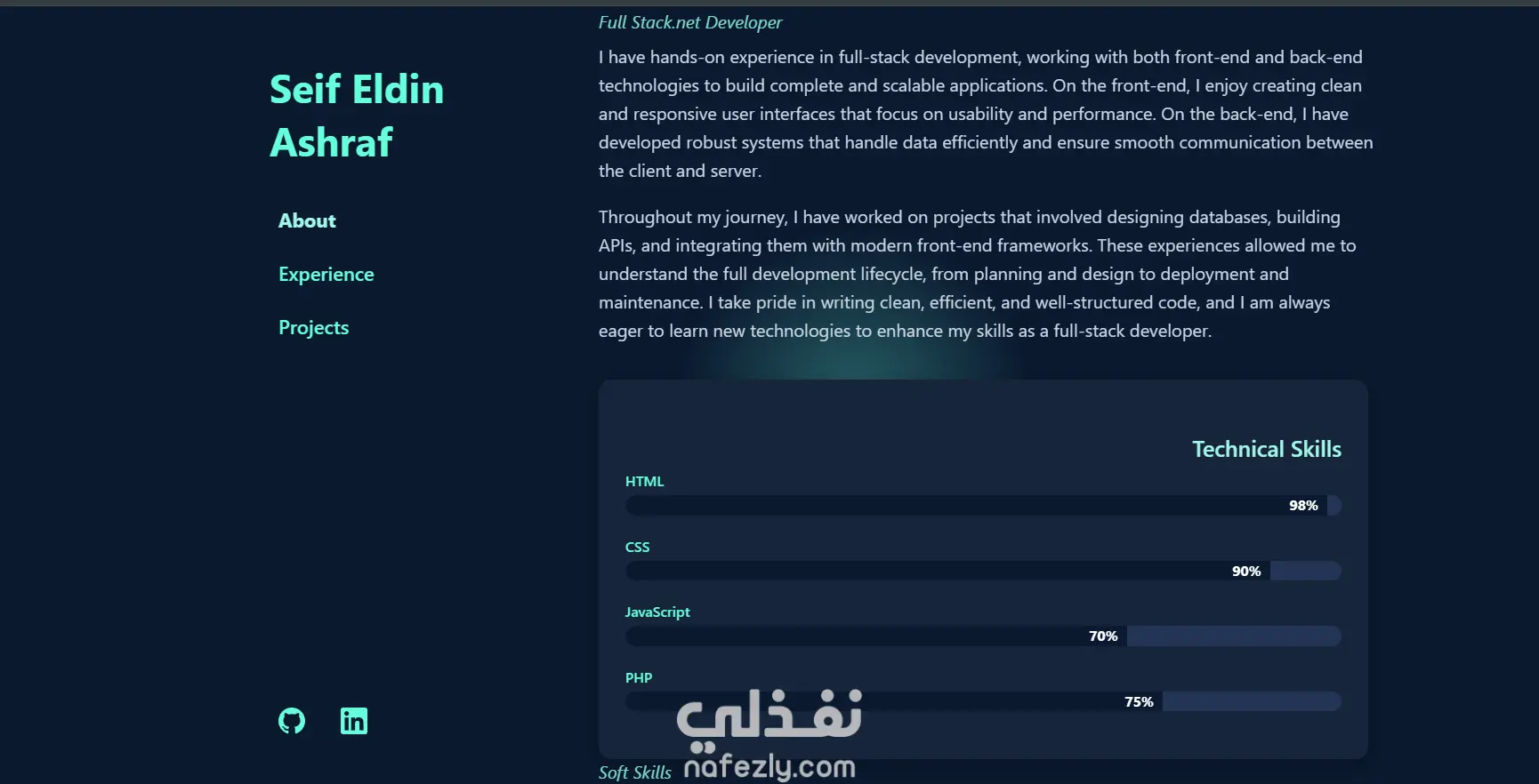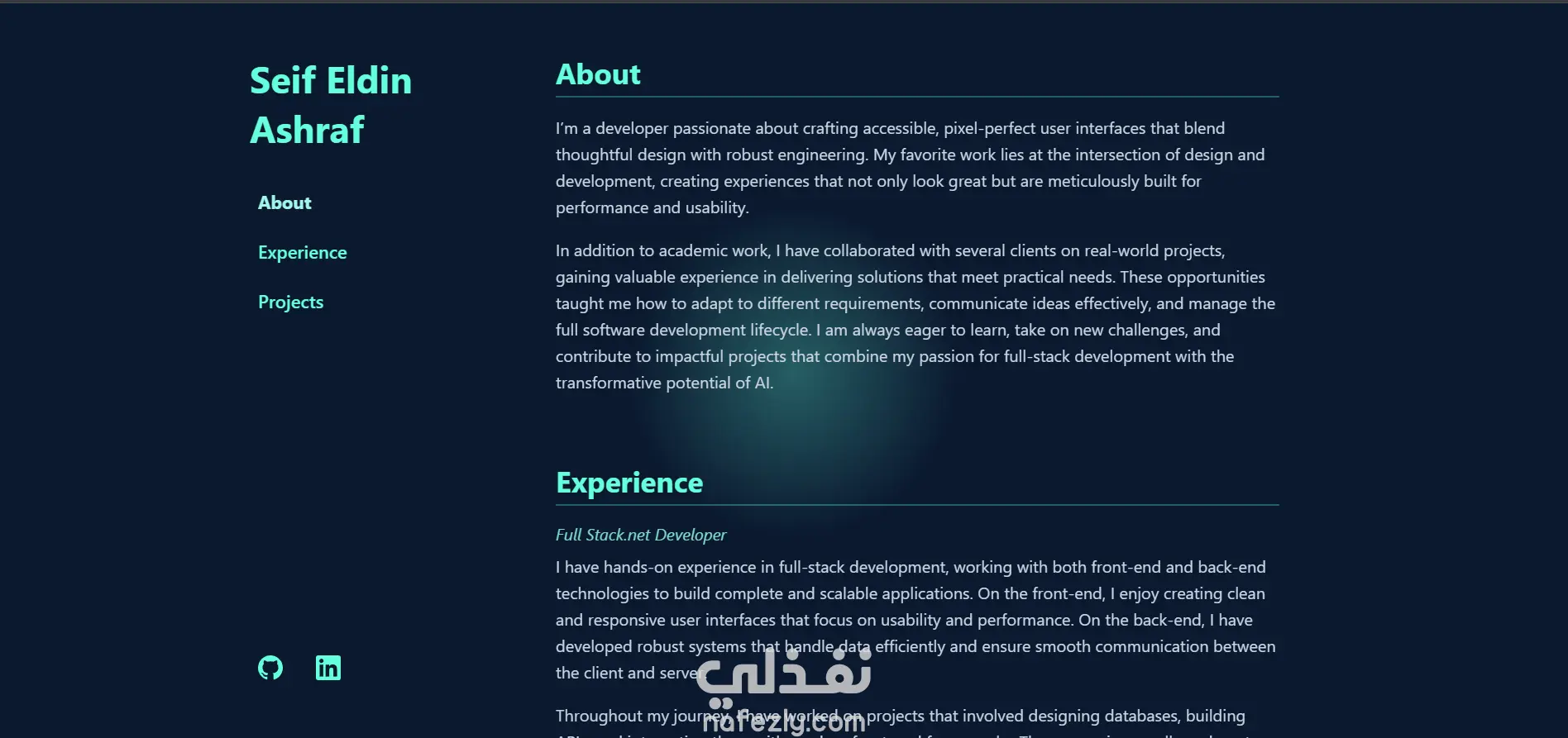 عنوان المشروع: تصميم ورفع موقع البورتفوليو الشخصي خلفية المشروع: قمت بإنشاء هذا الموقع لعرض مشاريع أعمالي في البرمجة والتصميم. الهدف هو توفير مكان أنيق ومنظم ليتمكن العملاء وأصحاب العمل من رؤية ما أنجزته. العملية والتنفيذ: ‒ بدأت بتخطيط هيكل الموقع (Sitemap) وتصميم أولي باستخدام Figma. ‒ بعد التصميم، قمت بترميز الواجهة باستخدام HTML وCSS، واستخدمت JavaScript للتفاعلية البسيطة. ‒ استخدمت Git لإدارة الإصدارات، ورفعت الموقع على استضافة مستقرة. ‒ اختبرت الموقع على مختلف الأجهزة للتأكد من تجربة مستخدم جيدة، وعدّلت بعض العناصر لتحسين الأداء. التقنيات المستخدمة: HTML5, CSS3, JavaScript, Git, Figma