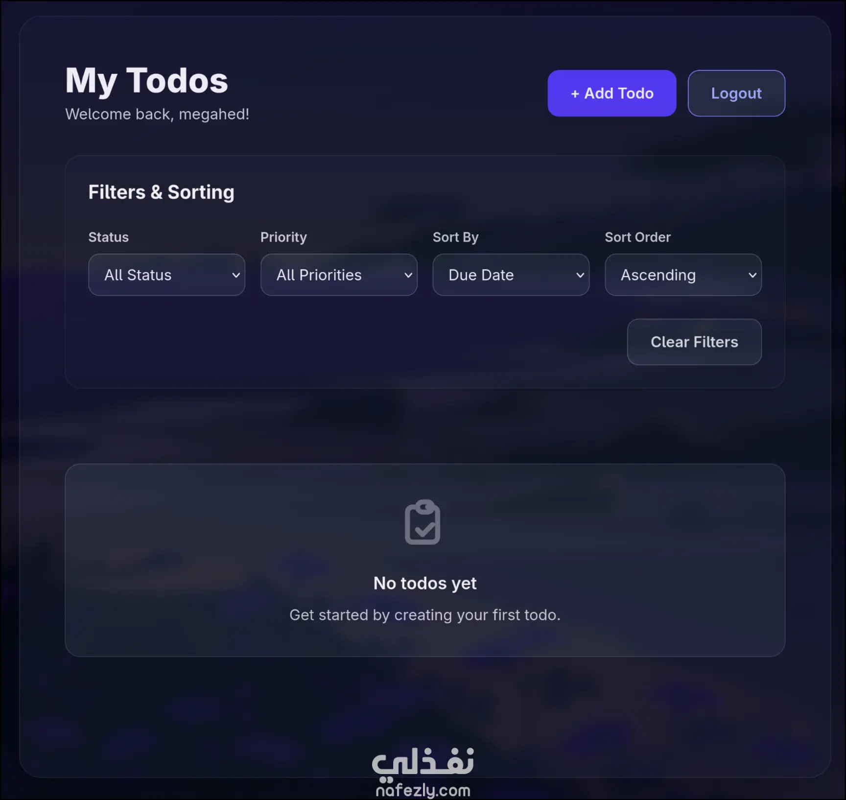 تطبيق قائمة مهام متكامل (Todo App) تم بناؤه باستخدام React، يتضمّن نظام تسجيل دخول للمستخدمين، وإدارة متقدّمة للمهام، وواجهة مستخدم حديثة ومتجاوبة.