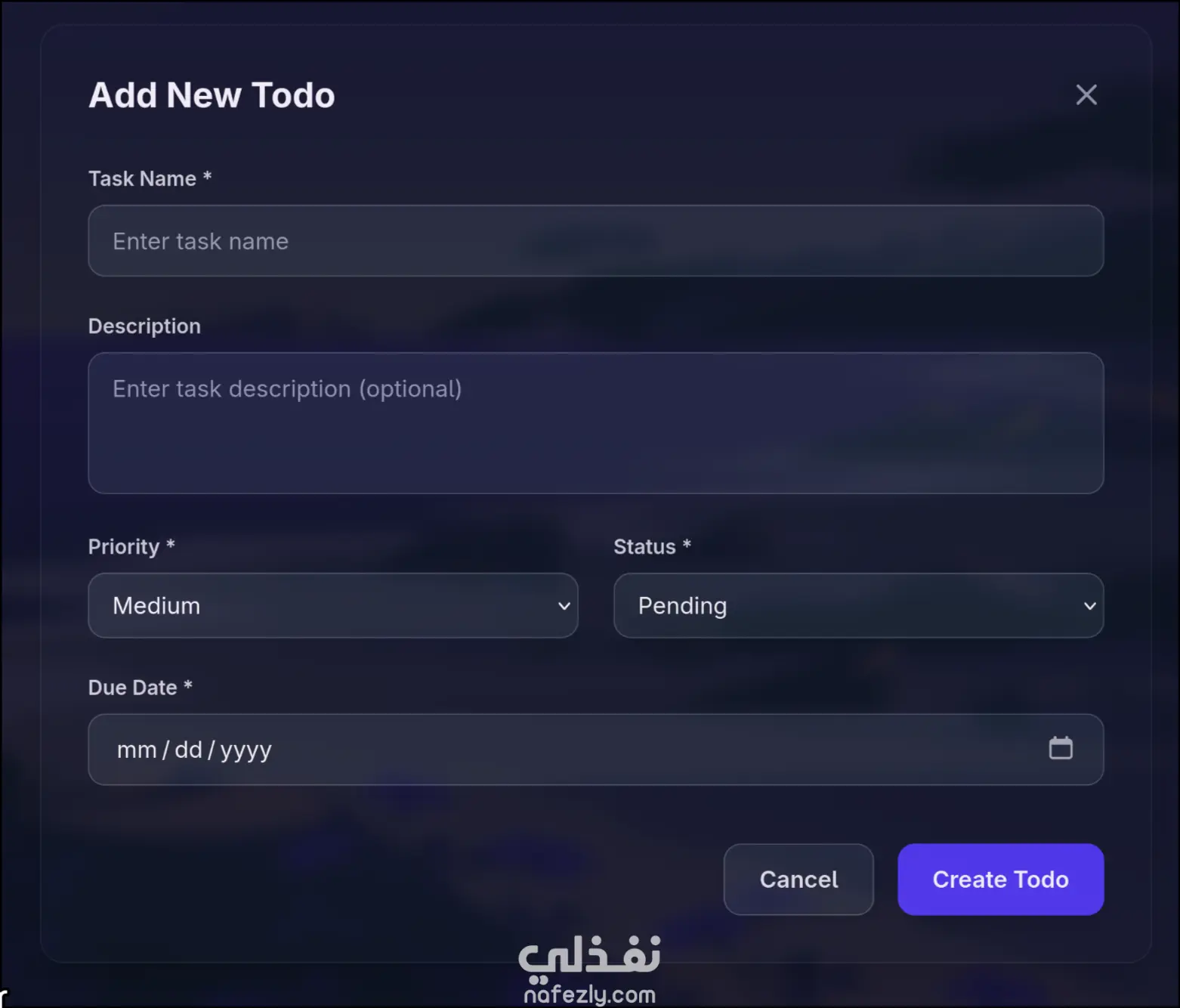 إنشاء مهام: إضافة مهام جديدة مع الاسم، الوصف، الأولوية، تاريخ الاستحقاق، والحالة