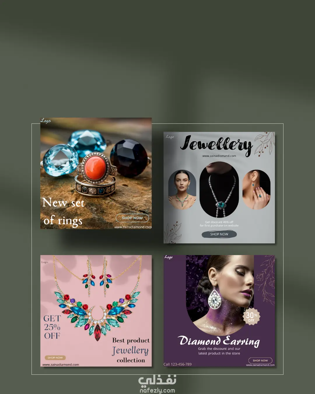 تصاميم سوشيال ميديا فاخرة للمجوهرات، تبرز جمال القطع وتفاصيلها بدقة عالية