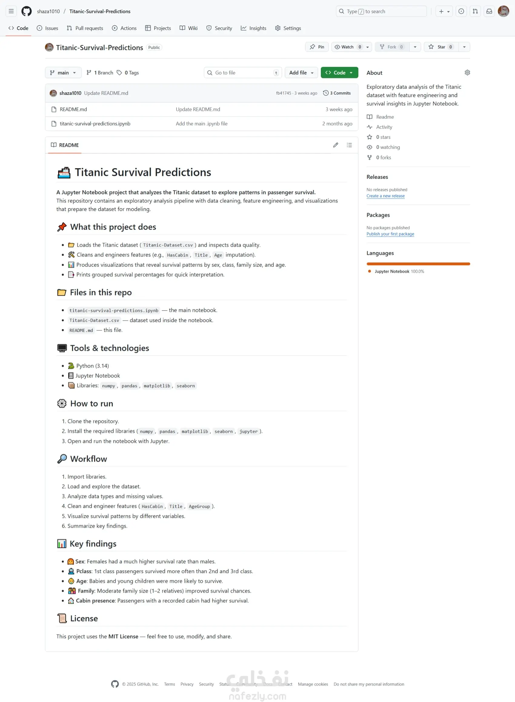 مشروع Jupyter Notebook لتحليل بيانات Titanic بهدف استكشاف أنماط نجاة الركاب. يحتوي هذا المستودع على خط أنابيب للتحليل الاستكشافي يشمل تنظيف البيانات، وهندسة الخصائص، وإجراء التصورات البيانية التي تهيئ مجموعة البيانات للنمذجة.