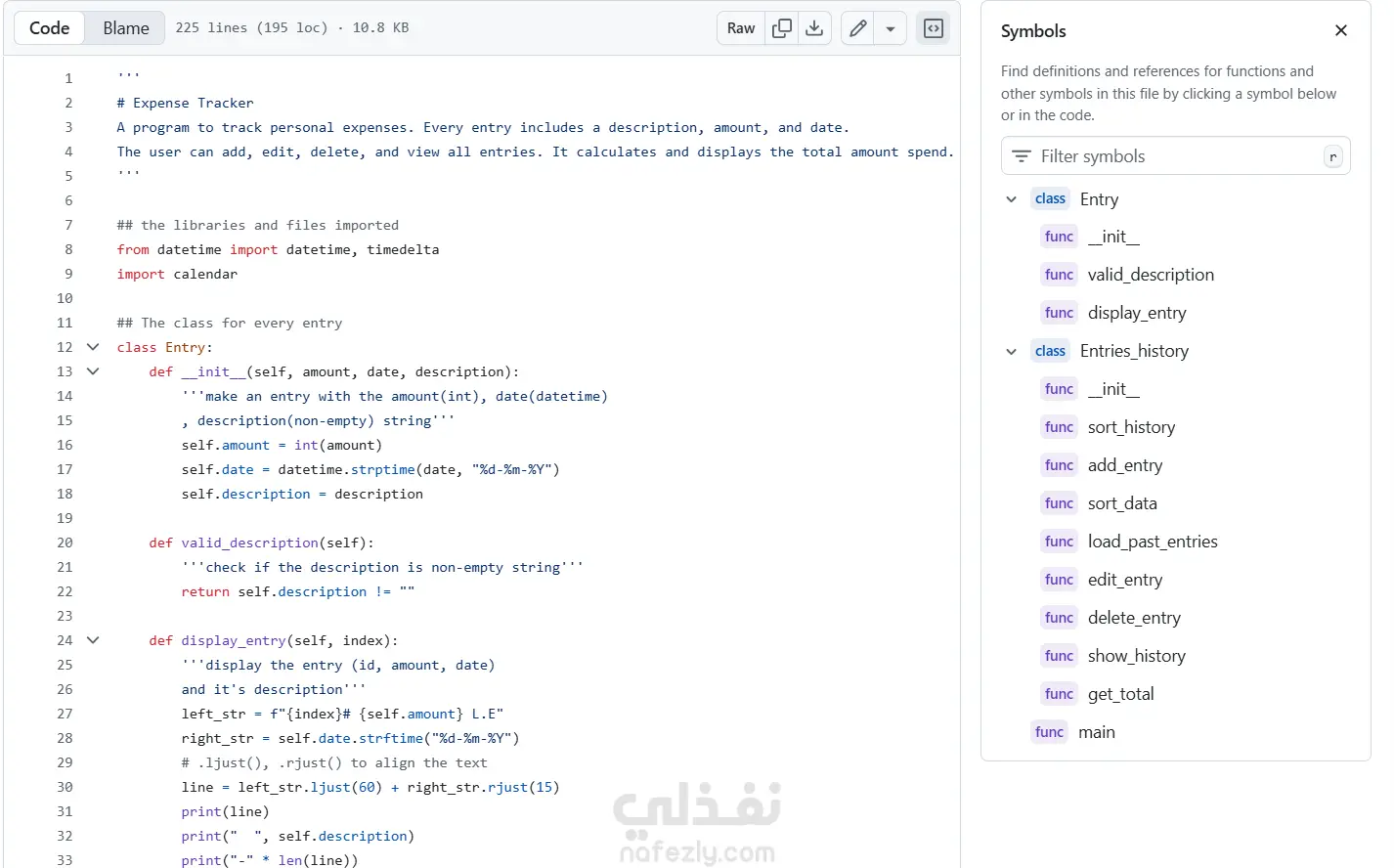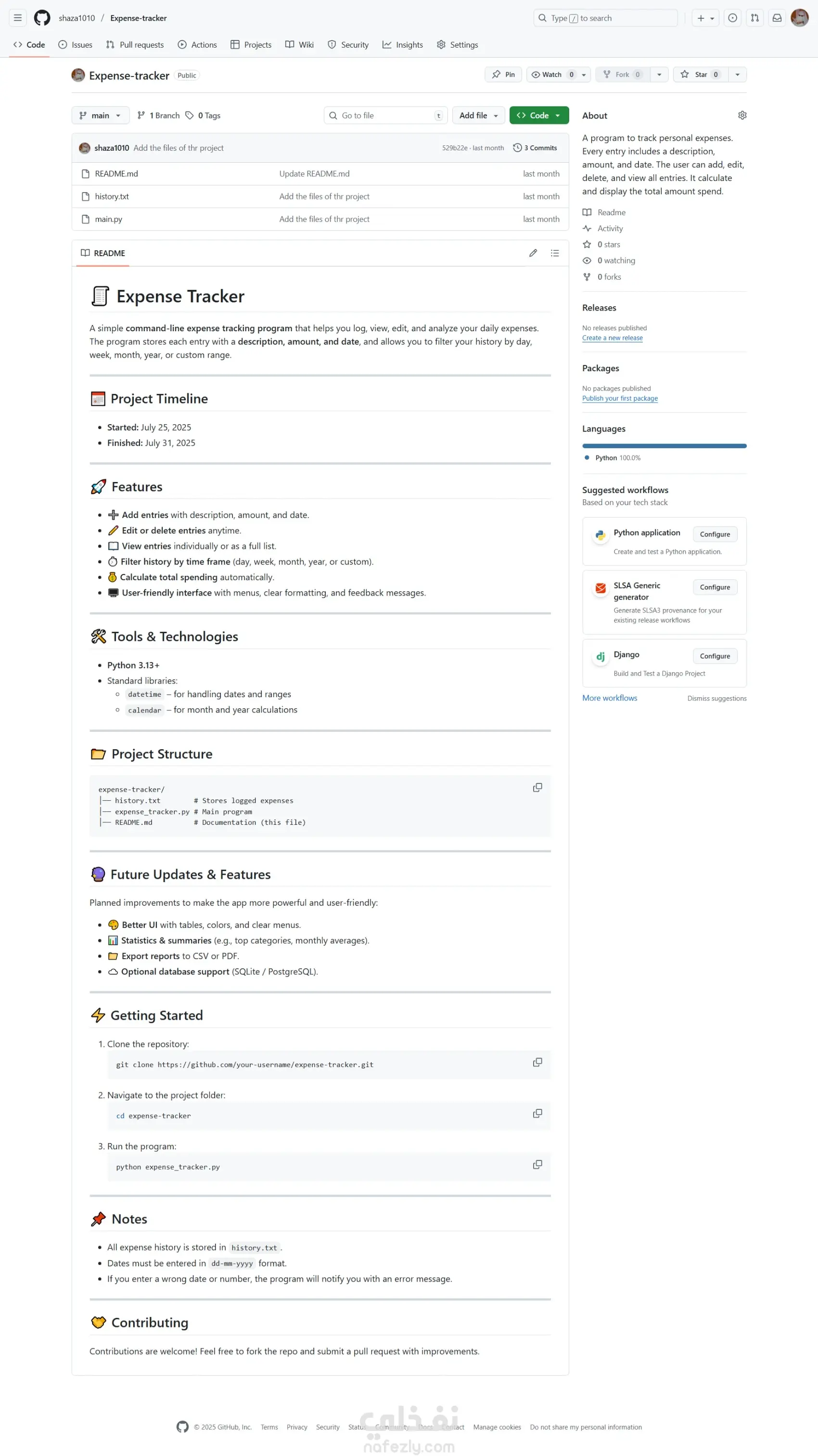 برنامج بسيط يعمل من خلال سطر الأوامر لمتابعة وتتبع المصروفات اليومية، حيث يتيح لك تسجيل، عرض، تعديل، وتحليل نفقاتك. يقوم البرنامج بتخزين كل عملية إنفاق مع الوصف، المبلغ، والتاريخ، كما يتيح لك تصفية السجل حسب اليوم، الأسبوع، الشهر، السنة، أو فترة مخصصة.