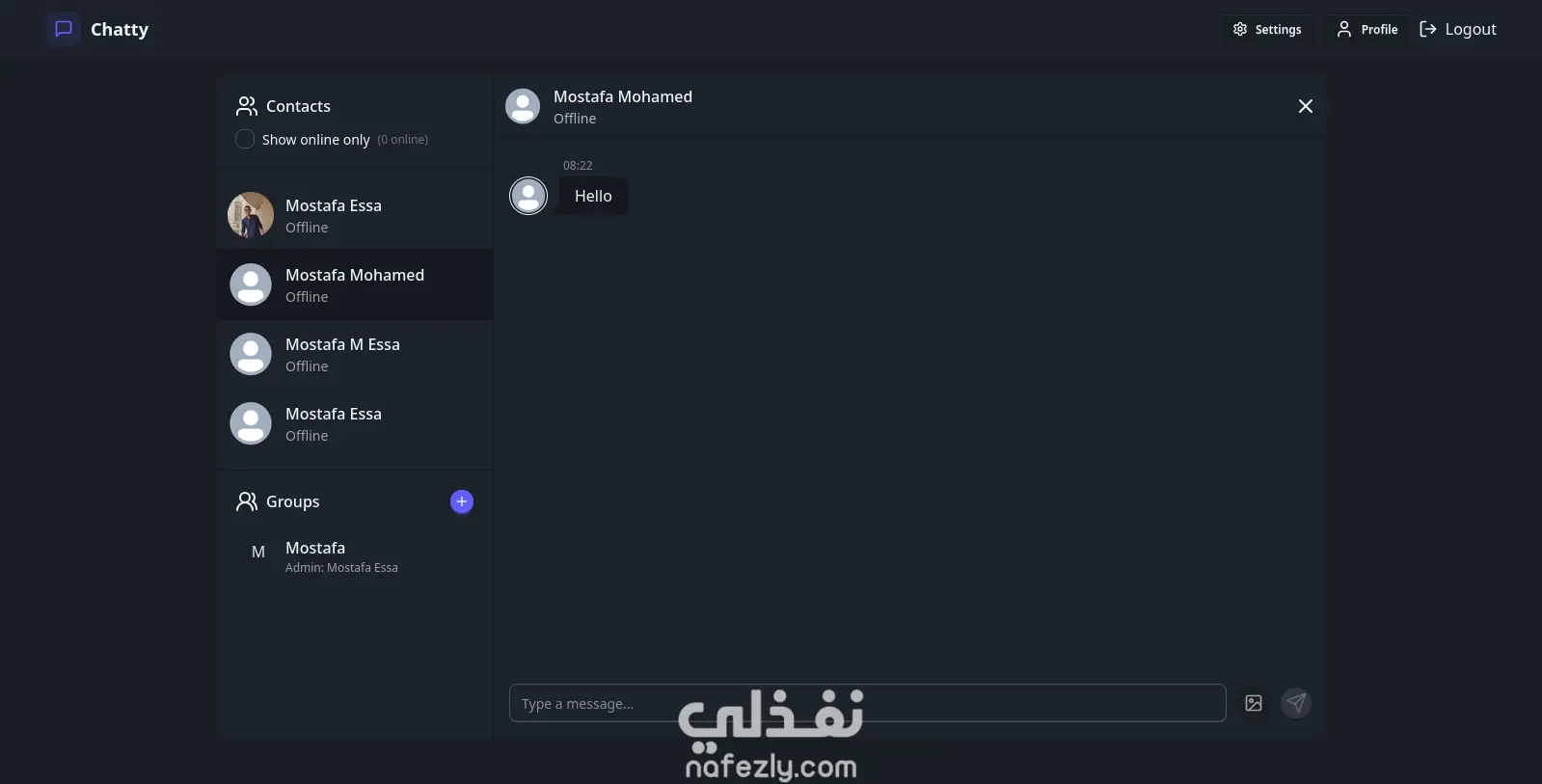 قمت بتطوير تطبيق محادثات حديث (Real-time Chat Application) باستخدام MERN Stack (MongoDB, Express.js, React, Node.js) مع دعم كامل للمراسلة الفورية سواء بشكل فردي أو داخل مجموعات.