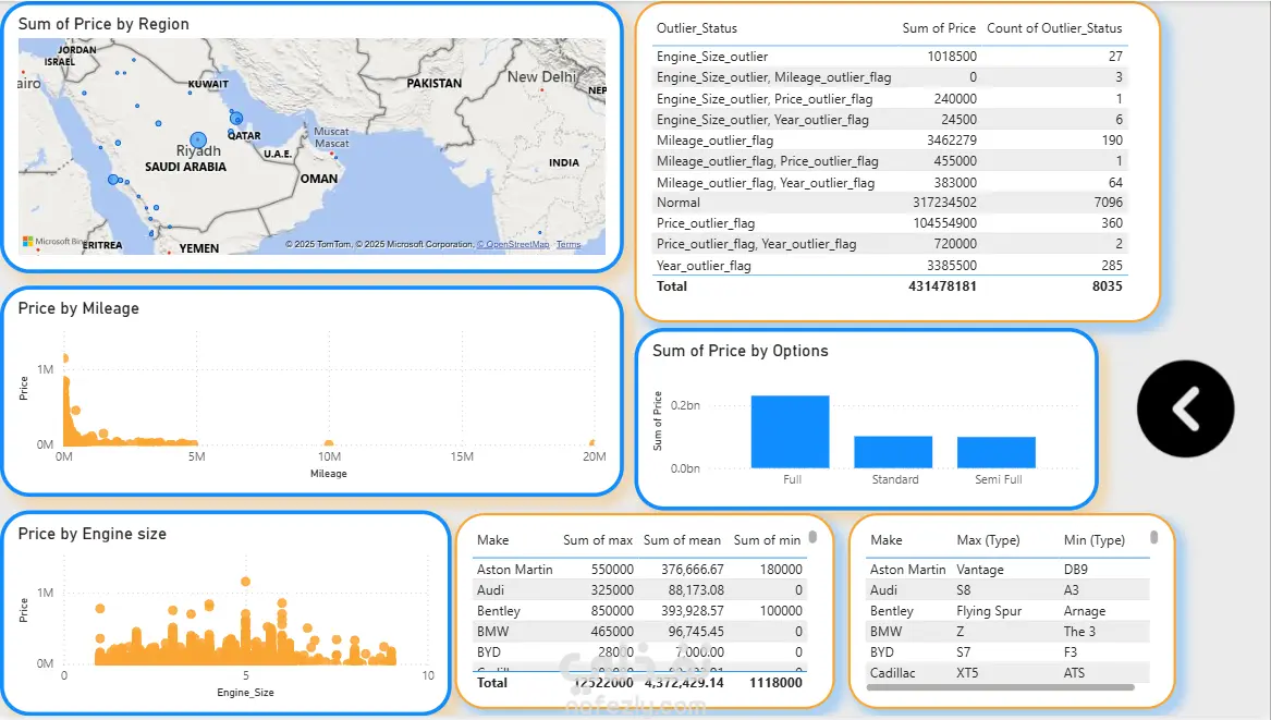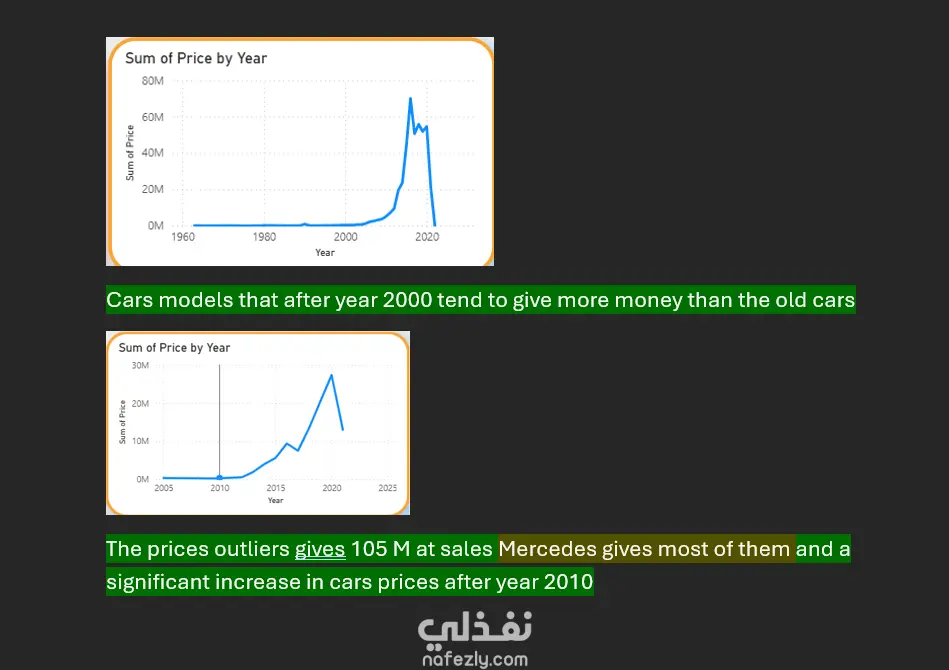 وصف المشروع: أقدم لكم مشروع تحليل بيانات شامل يركز على سوق السيارات المستعملة في السعودية، بعنوان "رؤى مدعومة بالبيانات حول سوق السيارات المستعملة في المملكة العربية السعودية". الهدف الرئيسي من المشروع هو تحليل السوق لتحديد فرص النمو في المبيعات، من خلال استكشاف بيانات حقيقية تشمل 8035 سجلًا (صفوف) و13 عمودًا، تغطي جوانب مثل العلامات التجارية، الأسعار، الخيارات، والمناطق. ملخص البيانات الرئيسي: عدد الشركات المصنعة: 54 شركة. إجمالي الأسعار: 431 مليون (وحدة غير محددة، ربما ريال سعودي). عدد السيارات الفاخرة: 1,147 سيارة. عدد السيارات القابلة للتفاوض: 2,527 سيارة. أبرز العلامات: تويوتا هي الأكثر شيوعًا. أبرز الطرازات: لاند كروزر هي الأكثر. أبرز الخيارات: الخيارات الكاملة (Full Options). نوع الوقود الأكثر: البنزين (Gas). نوع التروس الأكثر: أوتوماتيكي. المنطقة الأكثر: الرياض. أقدم وأحدث سنة تصنيع: من 1963 إلى 2022. أغلى السيارات: فيراري، رولز رويس، وأستون مارتن. المناطق ذات القيمة العالية: الرياض، جدة، والدمام. العلامات الفاخرة: تشمل مرسيدس، بي إم دبليو، لكزس، كاديلاك، إنفينيتي، أودي، بورش، لاند روفر، جاكوار، رولز رويس، بنتلي، أستون مارتن، مازيراتي، فيراري، وجينيسيس. التحليل الرئيسي: في هذا المشروع، قمت بإنشاء ميزات جديدة لتعزيز التحليل، مثل: عمود "عمر السيارة" (Car Age). عمود "هل هي فاخرة؟" (Is_Luxury). جدول محوري لمتوسط الأسعار حسب الخيارات. جدول محوري لعدد الطرازات حسب العلامة التجارية (لتحديد الأكثر والأقل شيوعًا). جدول محوري للأسعار حسب العلامة التجارية. جدول محوري للسيارات القابلة للتفاوض. تم التعامل مع القيم الشاذة (Outliers) بعلامتها للدراسة الإضافية دون إزالتها. لاحظنا أن الأسعار الصفرية ترتبط دائمًا بالسيارات القابلة للتفاوض، مما يشير إلى أنها غير مباعة أو أسعارها غير نهائية. تويوتا هي الأكثر في المبيعات والسيارات القابلة للتفاوض. السيارات بعد عام 2000 (خاصة بعد 2010) تحقق أسعارًا أعلى، بينما السيارات ذات المسافات المقطوعة الكبيرة أرخص. السيارات القديمة (قبل 2000) غالبًا ما تكون يدوية التروس ولها مسافات مقطوعة عالية. التوصيات: بناءً على التحليل، أوصي بـ: التركيز على السيارات بعد عام 2000 (خاصة بعد 2010) لأنها تحقق مبيعات أعلى وأسعار أفضل. التركيز على علامات مثل تويوتا ومرسيدس، بالإضافة إلى أفضل 10 علامات أخرى. الاهتمام بالسيارات الأوتوماتيكية، التي تعمل بالبنزين، ذات المسافات المقطوعة المنخفضة، العمر القليل، والخيارات الكاملة، لزيادة فرص البيع. تعزيز الجهود في المناطق الرئيسية: الرياض، جدة، والدمام، حيث ترتفع قيمة المبيعات. التركيز على العلامات الفاخرة، التي تشكل 143 مليون من إجمالي 431 مليون، رغم أنها 15 علامة فقط من 59. الاهتمام بالسيارات القابلة للتفاوض (2527 سيارة، أي 31.45% من الإجمالي) من خلال العروض الترويجية لتسريع بيعها.