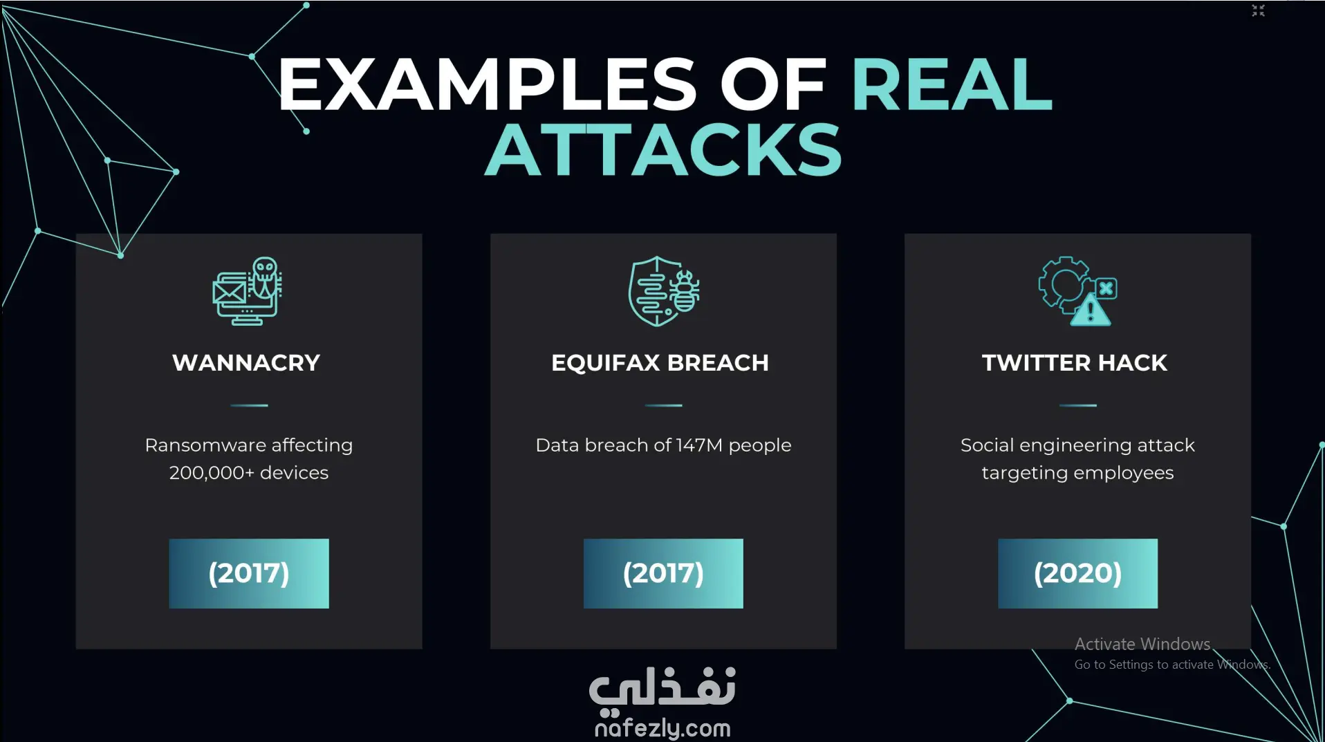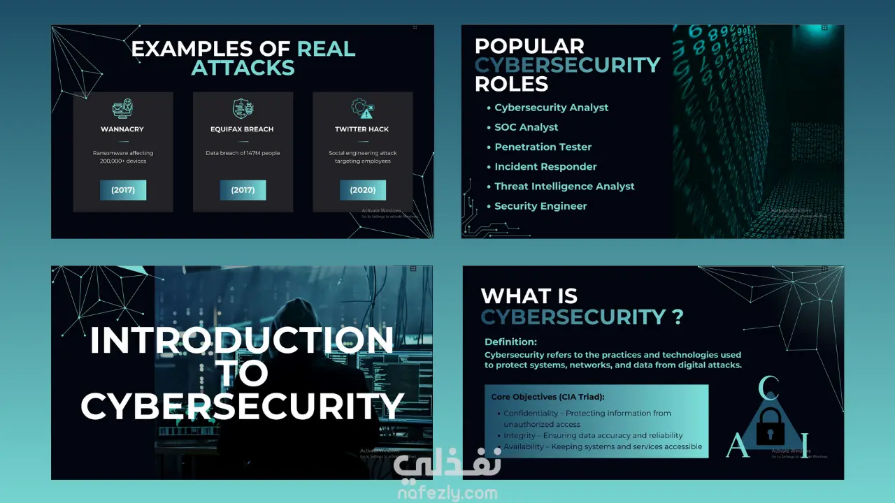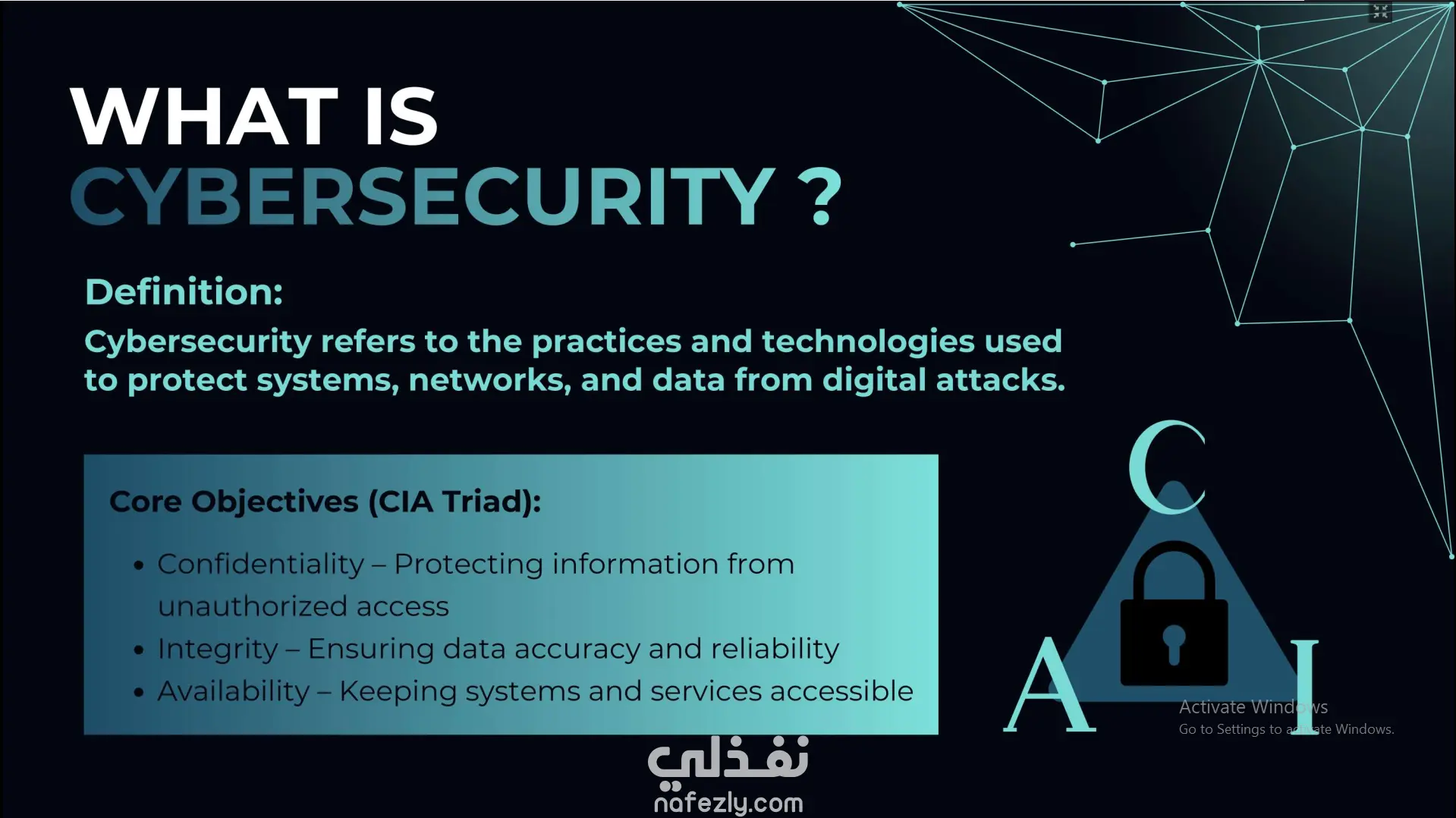 قمت بعمل عرض تقديمي احترافي كامل حول موضوع الأمن السيبراني (Cybersecurity)، يتضمن محتوى تعليمي مبسّط ومنسّق بصريًا باستخدام أسلوب حديث واحترافي مناسب للعروض الأكاديمية، التدريبية، أو التقديمات التقنية. العرض يحتوي على: مقدمة واضحة عن الأمن السيبراني شرح مبسّط لـ CIA Triad أنواع التهديدات والهجمات السيبرانية أشهر أساليب الهجوم (Social Engineering – Malware – DDoS – وغيرها) أفضل ممارسات الحماية دور المؤسسات في الأمن السيبراني وظائف الأمن السيبراني أمثلة لهجمات حقيقية سلايد ختامي مع سؤال للنقاش