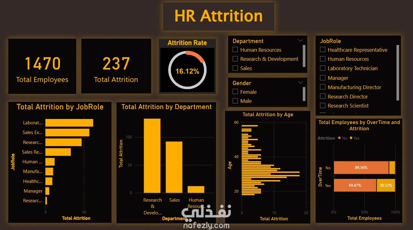 مشروع متقدم في تحليل بيانات الموارد البشرية، تم تصميمه باستخدام Power BI لفهم الأسباب الجذرية وراء "تسرب الموظفين" (HR Attrition) في إحدى الشركات. الهدف هو تحويل بيانات الموظفين المعقدة إلى رؤى واضحة وقابلة للتنفيذ، لمساعدة الإدارة على تحسين بيئة العمل والاحتفاظ بالكفاءات. **تغطي لوحة البيانات هذه المحاور الرئيسية التالية:** * ملخص الأداء (KPIs): عرض فوري لأهم المؤشرات، مثل إجمالي عدد الموظفين (1470)، إجمالي عدد الموظفين المتسربين (237)، وتحديد معدل التسرب العام بدقة (16.12%). * التحليل الديموغرافي: تحليل تفاعلي لمعدلات التسرب بناءً على: * القسم (Department): تحديد الأقسام الأكثر تسرباً (مثل "Research & Development" و "Sales"). * المسمى الوظيفي (JobRole): تحديد الوظائف التي تعاني من أعلى معدلات مغادرة (مثل "Laboratory Technician" و "Sales Executive"). * العمر (Age): ملاحظة أن التسرب يتركز في فئة عمرية معينة (بين 20 و 35). * تحليل عوامل الرضا الوظيفي (Deeper Insights): * ربط التسرب بعوامل حاسمة مثل (العمل الإضافي)، (السنوات منذ آخر ترقية)، (السنوات مع المدير الحالي)، و(نسبة زيادة الراتب). **أهم الرؤى الاستراتيجية (Key Insights) المستخلصة من الداش بورد:** 1. العمل الإضافي (Overtime): التحليل يوضح بشكل قاطع أن الموظفين الذين يعملون وقتاً إضافياً لديهم معدل تسرب أعلى بكثير (يصل إلى 30.53%)، مما يشير إلى وجود مشكلة إرهاق (Burnout) واضحة. 2. الترقيات والرواتب: يُظهر التحليل أن أعلى معدل تسرب يحدث بين الموظفين الذين لم يحصلوا على ترقية مؤخراً (0 سنوات منذ آخر ترقية) وأولئك الذين حصلوا على نسب زيادة راتب منخفضة (بين 10-15%). 3. الولاء والخبرة: الموظفون الجدد (0-2 سنوات في الشركة) هم الأكثر عرضة للمغادرة، مما يستدعي تحسين برامج التأقلم والتدريب . *القيمة المضافة للمشروع: هذه الداش بورد تمكّن قسم الموارد البشرية من الانتقال من "رد الفعل" إلى "الفعل الاستباقي". بدلاً من مجرد معرفة من استقال، يمكنهم الآن معرفة لماذا استقالوا، وتوجيه جهودهم وميزانياتهم بفاعلية للاحتفاظ بالمواهب وتقليل تكلفة دوران الموظفين.