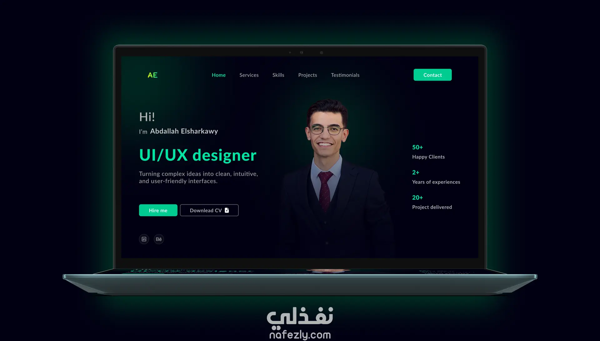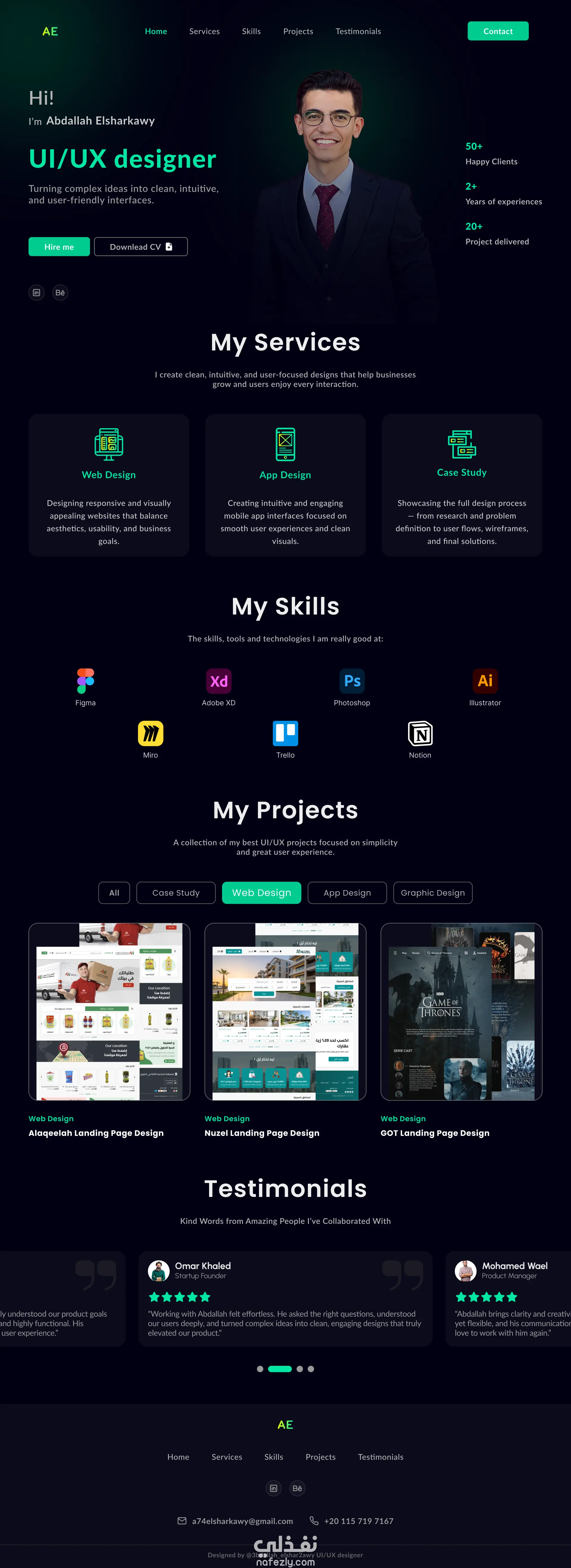 التصميم بيحتوي على قسم تعريفي، أبرز المشاريع، نبذة عن المصمم، وقسم تواصل – في تصميم متجاوب ومنسق بعناية.