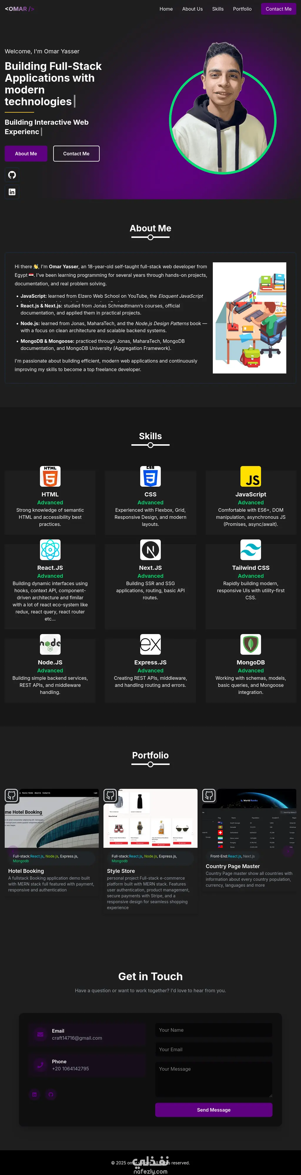 موقع شخصي احترافي مطور بالكامل باستخدام Next.js يعرض مهاراتي وخبراتي كمطور Full-Stack، مصمم بتقنيات حديثة وأداء محسن.