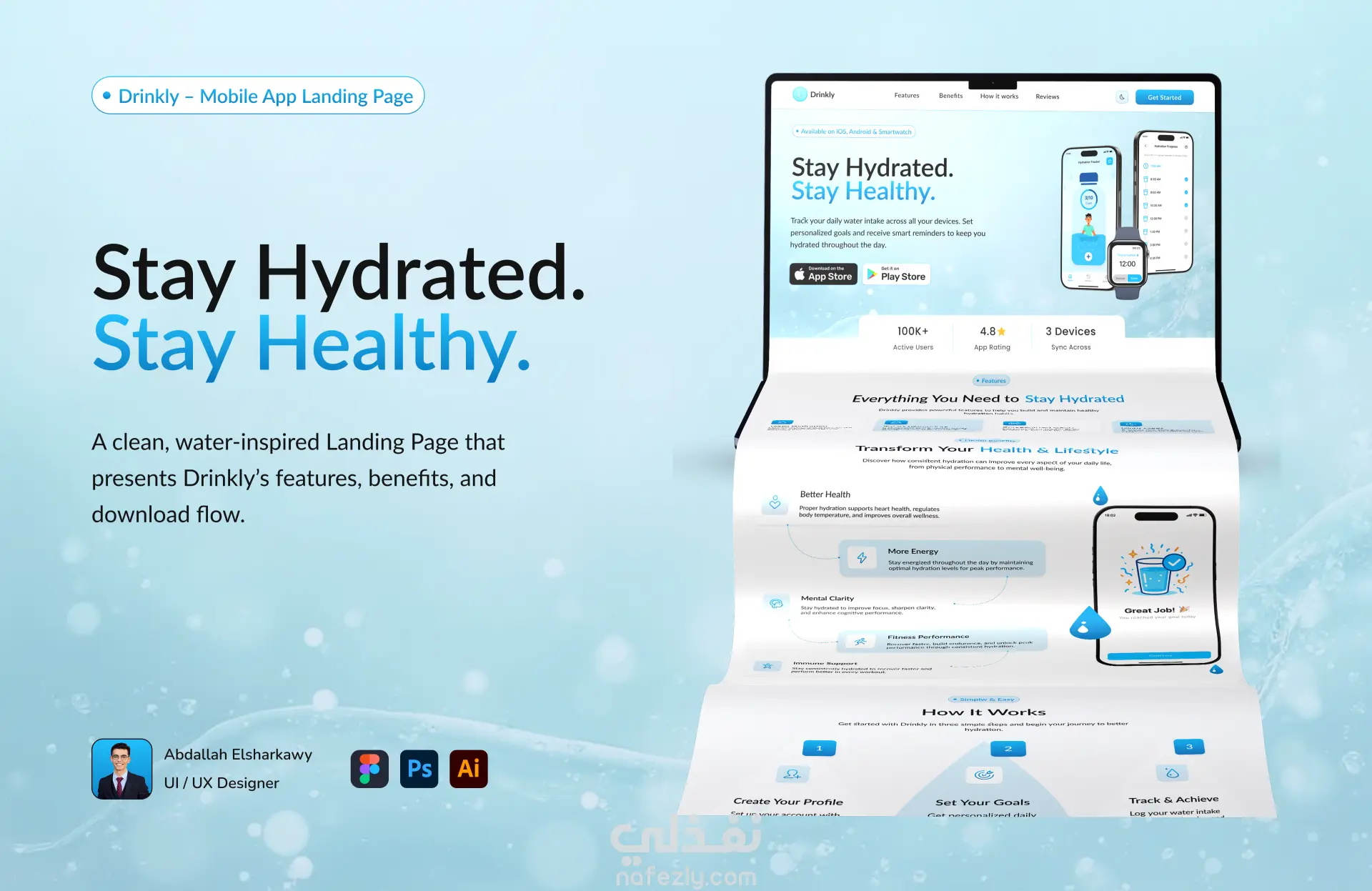 صُممت هذه الصفحة الرئيسية لتقديم تطبيق Drinkly بطريقة احترافية وجذابة، مع التركيز على إبراز وظائف التطبيق وفوائده الصحية بشكل بسيط وواضح.