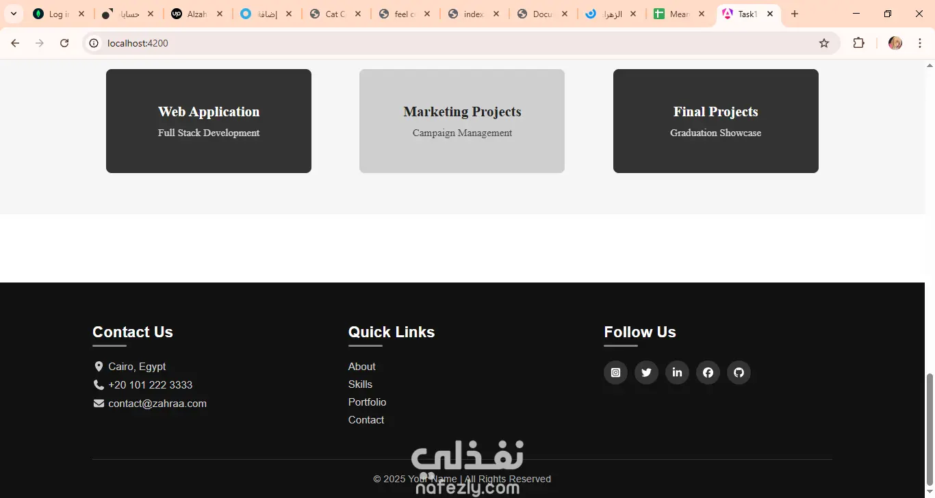 بناء تذييل شامل يضم معلومات الاتصال، روابط سريعة للتنقل داخل الموقع، ومنصات التواصل الاجتماعي.