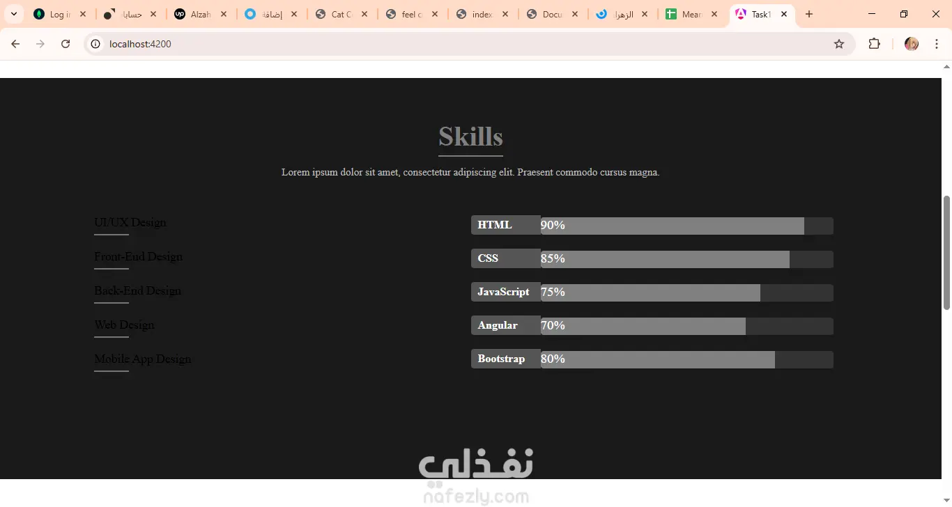 تنفيذ قسم "المهارات" الديناميكي (Skills) باستخدام أشرطة تقدم (Progress Bars) لتحديد مستوى الإتقان في التقنيات الأساسية (HTML, CSS, JavaScript, Angular, Bootstrap).