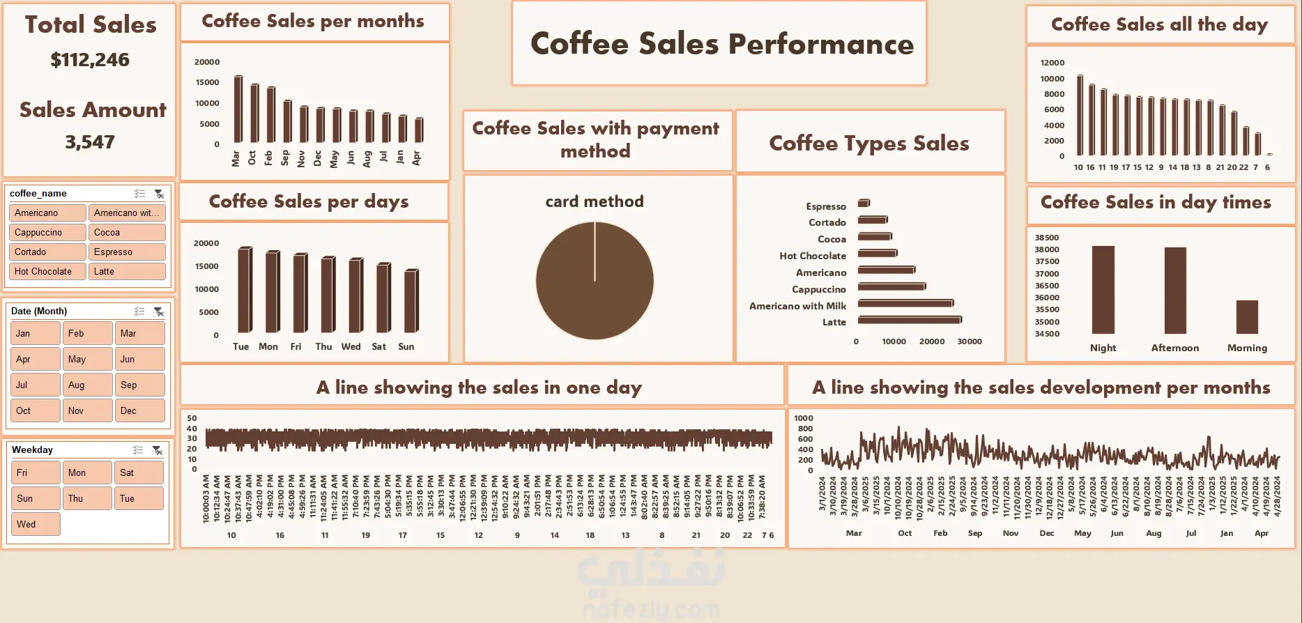 هذا مشروعي أهدف إلى تحليل بيانات مبيعات القهوة ، (نوع المشروب، طريقة الدفع، المبلغ، التاريخ، الوقت، الفترة، اليوم، والشهر). ركزت في التحليل على: 1- تحديد أكثر المشروبات مبيعًا بحيث يتم التركيز عليها في الجودة والخدمة . 2- معرفة أوقات اليوم وأيام الذروة في المبيعات بحيث يتم تجهيز العمليات بشكل افضل . 3- مقارنة المبيعات الشهرية وفترات اليوم. 4- دراسة طرق الدفع (كاش/كارت) ونسب استخدامها. 5- عرض إجمالي المبيعات اليومية والشهرية وعدد الأصناف المباعة 6- متابعة تطور المبيعات خلال اليوم الواحد وخلال الشهور وسيتم تقديم النتائج عبر Dashboard تفاعلي يحتوي على رسوم بيانية ولوحات توضح الرؤية بشكل مبسط واحترافي لمساعدة الإدارة في اتخاذ قرارات أفضل وزيادة المبيعات.