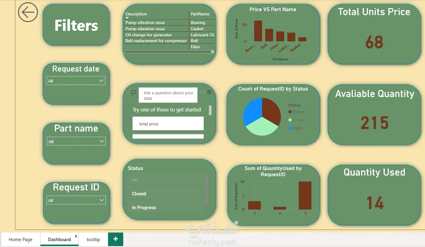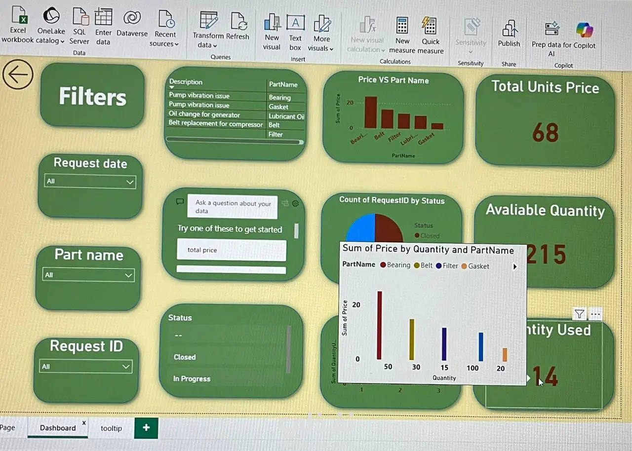قمت بتصميم قاعدة بيانات باستخدام SQL حيث يمكنها مراقبة الورشة وتحليل الأداء بكل سهولة بالإضافة الى تصميم داش بورد تفاعلية مربوطة مباشرة بقاعدة البيانات ويتم تحديثها باستمرار باستخدام Power BI