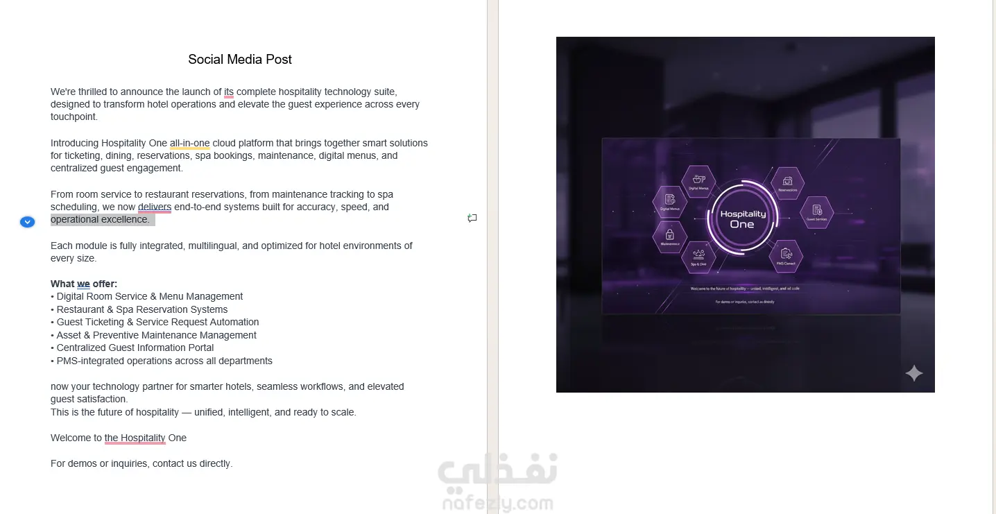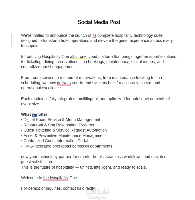 عرض تقديمي بسيط وواضح يشرح نظامًا تقنيًا متكاملًا لإدارة الفنادق. يشمل القوائم الرقمية، الخدمة الفندقية، الحجوزات، السبا، الصيانة، طلبات الضيوف، ومنصة مركزية تربط كل شيء. يوضح العرض المميزات والفوائد بطريقة سهلة ومباشرة.