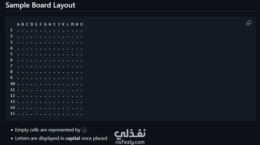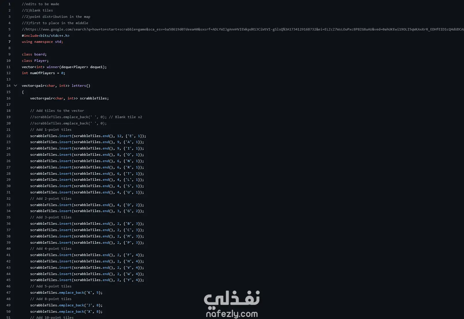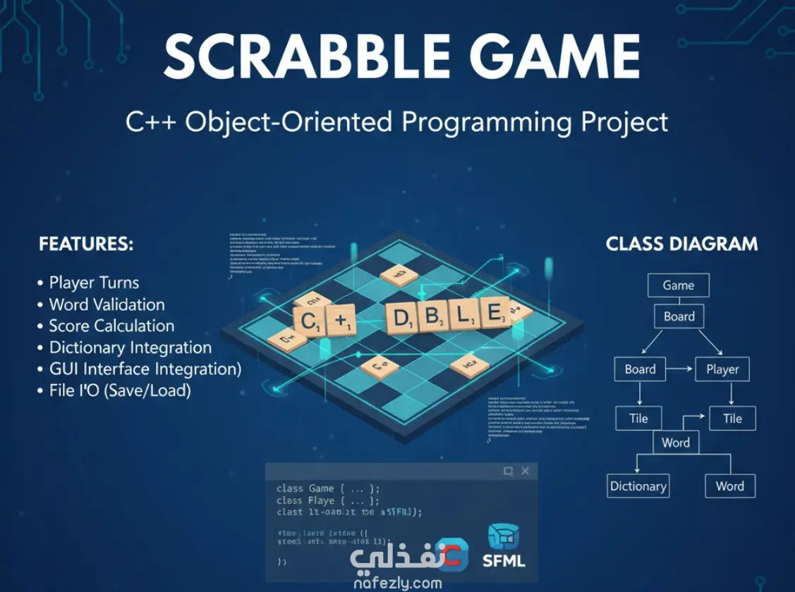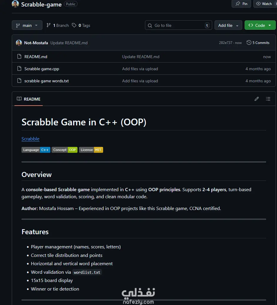 نظرة عامة دي لعبة Scrabble على الكونسول، متبرمجة بـ C++ باستخدام مبادئ البرمجة الكائنية (OOP). اللعبة بتدعم 2-4 لاعبين، فيها نظام نقاط، تحقق الكلمات من القاموس، و اللعب بالتناوب. الكود منظم باستخدام Classes زي Player و Board، ودي مش أول تجربة ليّا في مشاريع OOP – عملت قبل كده مشاريع زي لعبة Scrabble C++ كاملة بالـ OOP. مميزات اللعبة إدارة اللاعبين (الاسم، النقاط، الأحرف) توزيع الأحرف والنقاط صح كتابة الكلمات أفقي أو عمودي التحقق من الكلمات باستخدام wordlist.txt عرض اللوحة (15x15) حساب الفائز أو التعادل