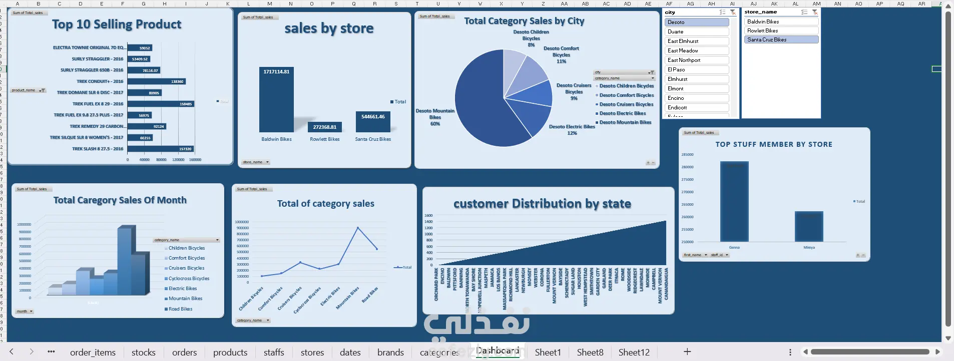 عملت Dashboard تفاعلية كاملة على Excel بتعرض مؤشرات المبيعات بشكل واضح وسهل، وبتساعد في متابعة أداء المنتجات والفروع والتصنيفات بطريقة منظمة وجذابة. أهم التحليلات الموجودة في اللوحة: عرض أفضل 10 منتجات مبيعًا. تحليل مبيعات كل فرع (Store). توزيع مبيعات التصنيفات حسب المدن. تحليل مبيعات التصنيفات شهريًا. مقارنة إجمالي مبيعات كل فئة. توزيع العملاء حسب الولايات. مقارنة أداء أفضل الموظفين مبيعًا في كل فرع.
