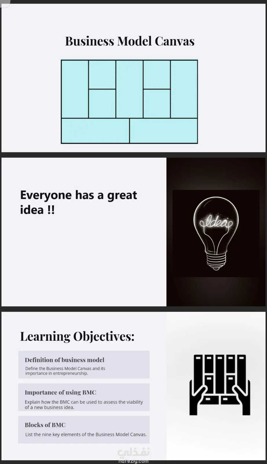 وصف المشروع: عرض تقديمي تدريبي – مخطط نموذج العمل (BMC) قمت بإعداد عرض تقديمي تدريبي احترافي حول مخطط نموذج العمل (Business Model Canvas – BMC)، بهدف تمكين المشاركين من فهم العناصر الأساسية لنموذج العمل بطريقة مبسطة وواضحة. محتوى العرض التقديمي: شروحات مفصلة لكل من العناصر التسعة لنموذج العمل. أمثلة عملية لتوضيح كيفية تطبيق كل عنصر. تصميم جذاب ومنسّق يسهل متابعة المعلومات وفهمها. مراجعة لغوية كاملة لضمان وضوح المحتوى وخلوه من الأخطاء. نتيجة المشروع: تقديم محتوى تدريبي مركز وواضح، جاهز للاستخدام في ورش العمل أو جلسات التدريب. تسهيل فهم المشاركين لكيفية تصميم نموذج عمل متكامل لأفكارهم أو مشاريعهم. مميزات العمل: تصميم احترافي وجذاب للعرض التقديمي. محتوى واضح وسهل الفهم لكل المستويات. تقديم معلومات مركّزة في قالب جاهز للعرض.