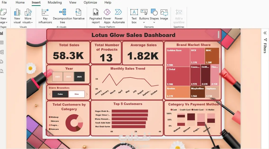 قمت بتصميم وتطوير لوحة تحكم شاملة للمبيعات على Power BI، تهدف إلى تحويل بيانات المبيعات إلى رؤى سريعة وواضحة. 1. 🧽 المرحلة الأولى: إعداد وتنظيف البيانات الأداة: استخدمت Power Query Editor لتنظيف وتجهيز البيانات. المهام الأساسية: نفّذت عمليات معالجة شاملة للبيانات تضمنت تنظيف البيانات، التعامل مع القيم المفقودة، وتوحيد التنسيقات لتحسين جودة مجموعة البيانات. ملاحظة: تم استخدام بيانات مُنشأة (اصطناعية) للتدريب، مما يدل على قدرتي على بناء لوحات تحكم احترافية من الصفر. 2. 📊 المرحلة الثانية: حسابات ومقاييس الأداء (DAX) -استخدمت لغة DAX لإنشاء مقاييس مالية وتحليلية دقيقة (مثل: إجمالي المبيعات، ومتوسط المبيعات). -تم حساب مؤشرات الأداء الرئيسية (KPIs) مثل المبيعات الكلية (58.3K) ومتوسط المبيعات (1.82K). 3. 🎨 المرحلة الثالثة: التصميم والمرئيات Visuals تم اختيار المرئيات لتكون سهلة القراءة وجذابة بصرياً. المرئيات البارزة: مخطط خطي: لتوضيح اتجاهات المبيعات الشهرية. رسوم بيانية: للمقارنة بين حصص العلامات التجارية وتفضيلات طرق الدفع. شرائح التصفية (Slicers): لإتاحة التفاعل مع البيانات وتصفيتها حسب السنة (Year) و فروع المتجر (Store Branches). 💡 أبرز ما يكشفه الداشبورد: 1-تحديد أفضل العملاء (Top 5 Customers). 2-مقارنة أداء فروع المتجر (القاهرة والجيزة). 3-تتبع اتجاهات المبيعات لتحديد أوقات الذروة.