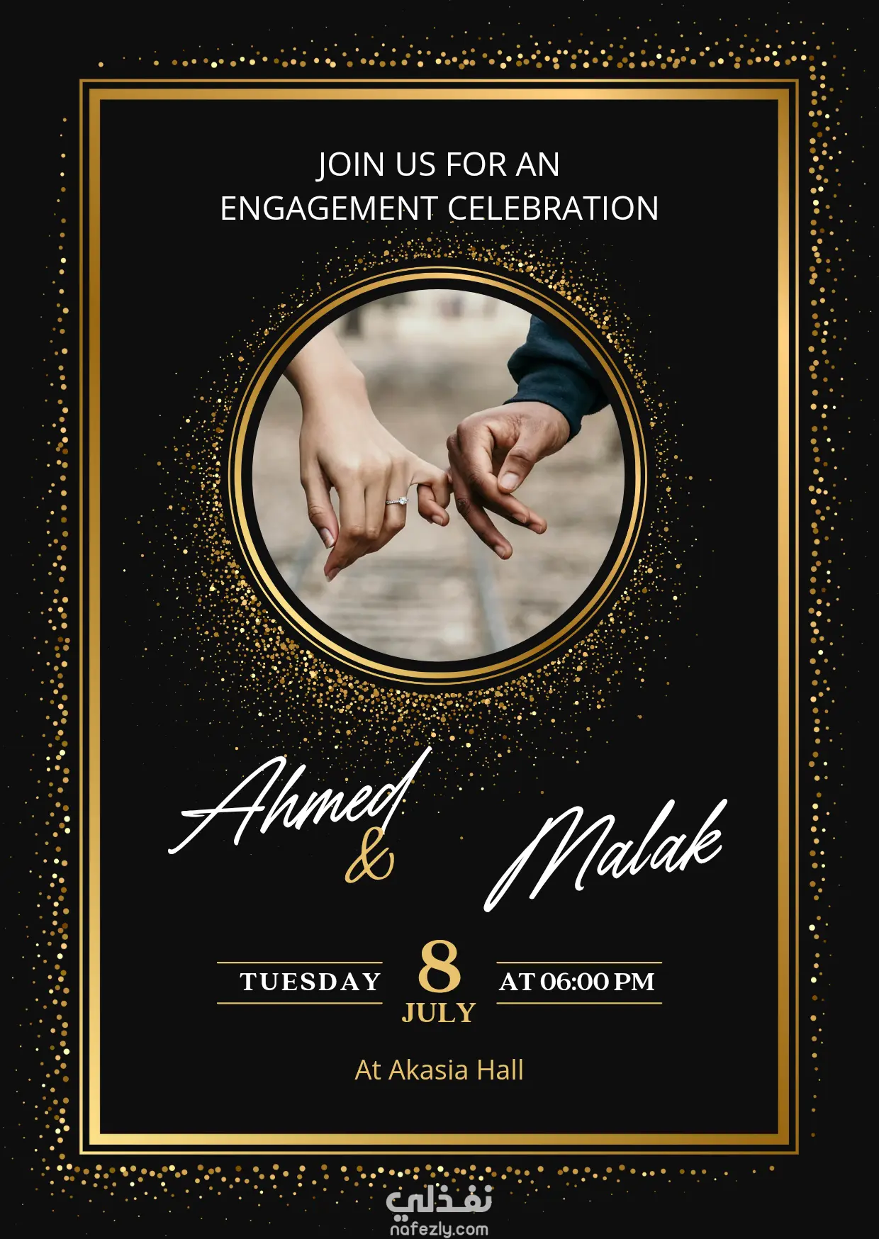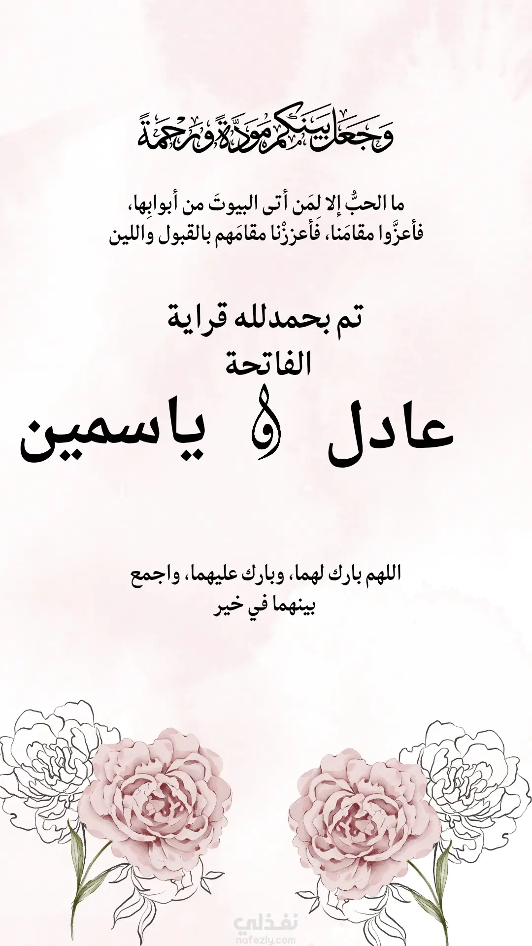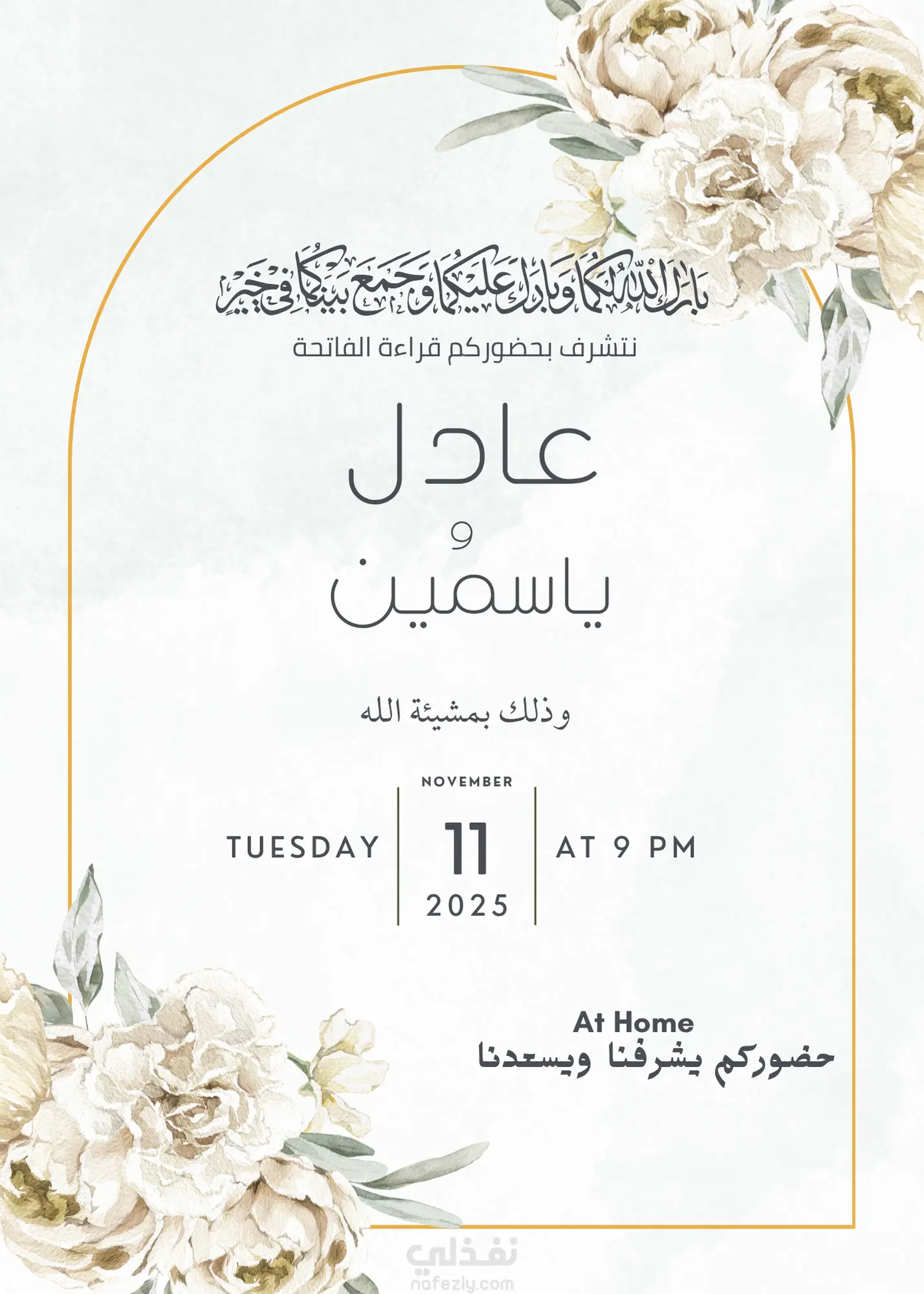 كارت أنيق يحتوي على اسم العروسين، تاريخ الحفل، والمكان. تصميمه باللونين الأبيض والذهبي مع لمسات ورود بسيطة.ويمكن إضافة صورة العروسين حسب الطلب