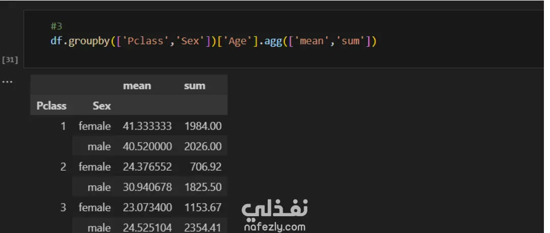 استخدام groupby لاستخراج أنماط مختلفة بين الفئات (مثل النجاة حسب الجنس أو درجة التذكرة).