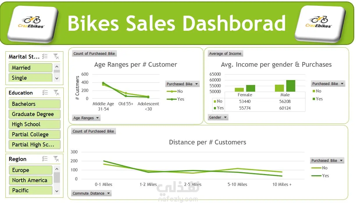 لوحة تحكم تفاعلية لمبيعات الدراجات حسب الفئة العمرية والدخل والمسافة (Interactive Bike Sales Dashboard by Age, Income, and Distance)