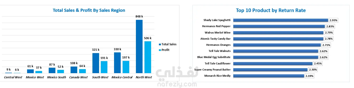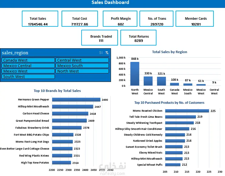 تُعد هذه اللوحة أداة مثالية لعرض وتحليل البيانات المتعلقة بالمبيعات في مجموعة من الفئات المختلفة، مما يسهل اتخاذ القرارات الاستراتيجية بشكل مستنير. تتضمن اللوحة العديد من المخططات والعروض التي تبرز الأداء حسب المناطق، المنتجات، والمدة الزمنية، بالإضافة إلى تقييم الأداء بناءً على معدل الإرجاع. 1. تحليل المبيعات حسب المنطقة والمنتج: المبيعات حسب المناطق: تقدم اللوحة تفصيلًا للمبيعات عبر المناطق الجغرافية المختلفة، مثل "North West" (الشمال الغربي)، التي سجلت أعلى مبيعات تصل إلى 848k، تليها مناطق "Mexico Central" (المكسيك الوسطى) و"South West" (الجنوب الغربي). يساعد هذا التحليل في توجيه استراتيجيات التسويق وتعزيز الأنشطة في المناطق ذات الأداء الضعيف. أفضل المنتجات حسب إجمالي المبيعات: يعرض الرسم البياني المنتجات العشرة الأولى من حيث إجمالي المبيعات. على رأس القائمة، نجد "Hermanos Green Pepper" (فلفل هيرمانوس الأخضر) مع 2490 وحدة مباعة، يليها منتجات مثل "Hilltop Mint Mouthwash" (غسول الفم هيلتوب بالنعناع). هذا القسم يساعد على تحديد المنتجات الأكثر تحقيقًا للإيرادات. أفضل المنتجات حسب الكمية المباعة: يتم أيضًا عرض قائمة المنتجات العشرة الأولى حسب الكمية المباعة. هذا يعكس تفضيلات العملاء بشكل أكبر، حيث تصدرت "Tell Tale Fresh Lima Beans" (فاصوليا ليمو طازجة تيل تيل) القائمة، مما يشير إلى أن هذه المنتجات هي الأكثر طلبًا من العملاء رغم اختلاف قيمتها المالية. 2. تحليل معدل الإرجاع: تكشف اللوحة أيضًا عن المنتجات التي سجلت أعلى معدلات إرجاع. على سبيل المثال، "Shady Lake Spaghetti" (سباغيتي شادي ليك) سجلت أعلى معدل إرجاع بنسبة 2.93%. هذه البيانات تشير إلى ضرورة إعادة تقييم جودة هذه المنتجات أو أساليب التسويق الخاصة بها لتقليل نسبة الإرجاع. 3. تحليل الأداء على مدار الأشهر: المبيعات والأرباح عبر الأشهر: توفر اللوحة أيضًا رؤية عن المبيعات والأرباح على مدار العام. يمكن ملاحظة التقلبات الموسمية في البيانات، حيث تسجل أشهر مثل "December" (ديسمبر) أعلى المبيعات (177k) بينما تسجل أشهر أخرى مثل "February" (فبراير) أقل مبيعات (83k). يساعد هذا التحليل في تحديد الأوقات المثلى للاستثمار في الحملات التسويقية والأنشطة الترويجية. 4. مبيعات الأرباح حسب المنطقة: إجمالي المبيعات والأرباح حسب المناطق: يتضمن القسم الأخير عرضًا بيانيًا يوضح المبيعات والأرباح لكل منطقة. على سبيل المثال، منطقة "North West" (الشمال الغربي) حققت أعلى مبيعات وأرباح، مما يعكس الأداء القوي في تلك المنطقة. يساعد هذا التحليل في تخصيص الموارد بشكل أكثر كفاءة وتعزيز المناطق التي قد تحتاج إلى تحسين توفر هذه اللوحة التفاعلية نظرة شاملة ومتعمقة عن أداء المبيعات عبر عدة مؤشرات مهمة مثل إجمالي المبيعات، الكمية المباعة، معدل الإرجاع، والأرباح حسب المنطقة. من خلال تحليل هذه البيانات، يمكن اتخاذ قرارات استراتيجية مبنية على المعلومات حول المنتجات الأكثر مبيعًا والمناطق الأفضل أداءً، إضافة إلى فهم سلوك العملاء من خلال معدلات الإرجاع. علاوة على ذلك، يُظهر التحليل الموسمي كيف يمكن التعامل مع فترات انخفاض المبيعات وزيادتها