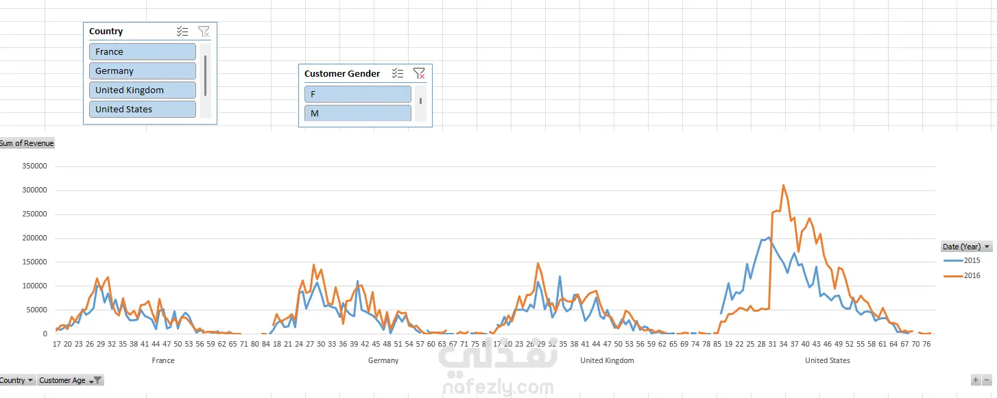 مقارنة بيانات المبيعات عبر المناطق: إنشاء مخطط أعمدة/أعمدة بيانية لمقارنة المبيعات ربع السنوية بين مناطق مختلفة. تخصيص الألوان لإبراز المنطقة الأعلى أداءً. تحليل اتجاهات العملاء على مدار الوقت: استخدام مخطط خطي لعرض كيف تغيرت تفضيلات العملاء خلال العام. إضافة خط اتجاه (Trendline) لإظهار الاتجاه العام والتنبؤ بالتغيرات المستقبلية. عرض توزيع أعمار العملاء: إنشاء هيستوجرام لتوضيح توزيع الأعمار بين العملاء. ضبط أحجام الفئات (Bins) لتحقيق وضوح أكبر وسهولة تفسير النتائج. النتيجة: المشروع قدّم تصورًا شاملًا لبيانات المبيعات وسلوك العملاء، مما ساعد على: تحديد المناطق الأعلى مبيعًا. تتبع أنماط تفضيلات العملاء عبر الزمن. فهم التركيبة العمرية للعملاء بدقة أكبر.
