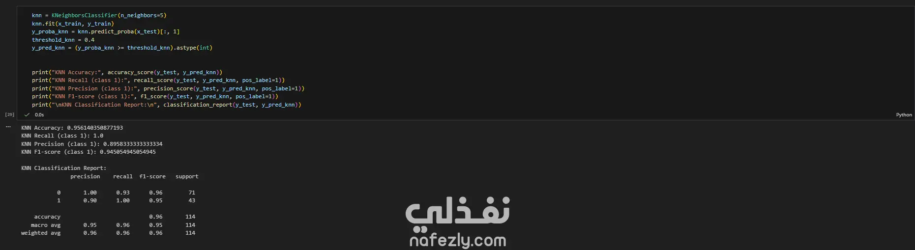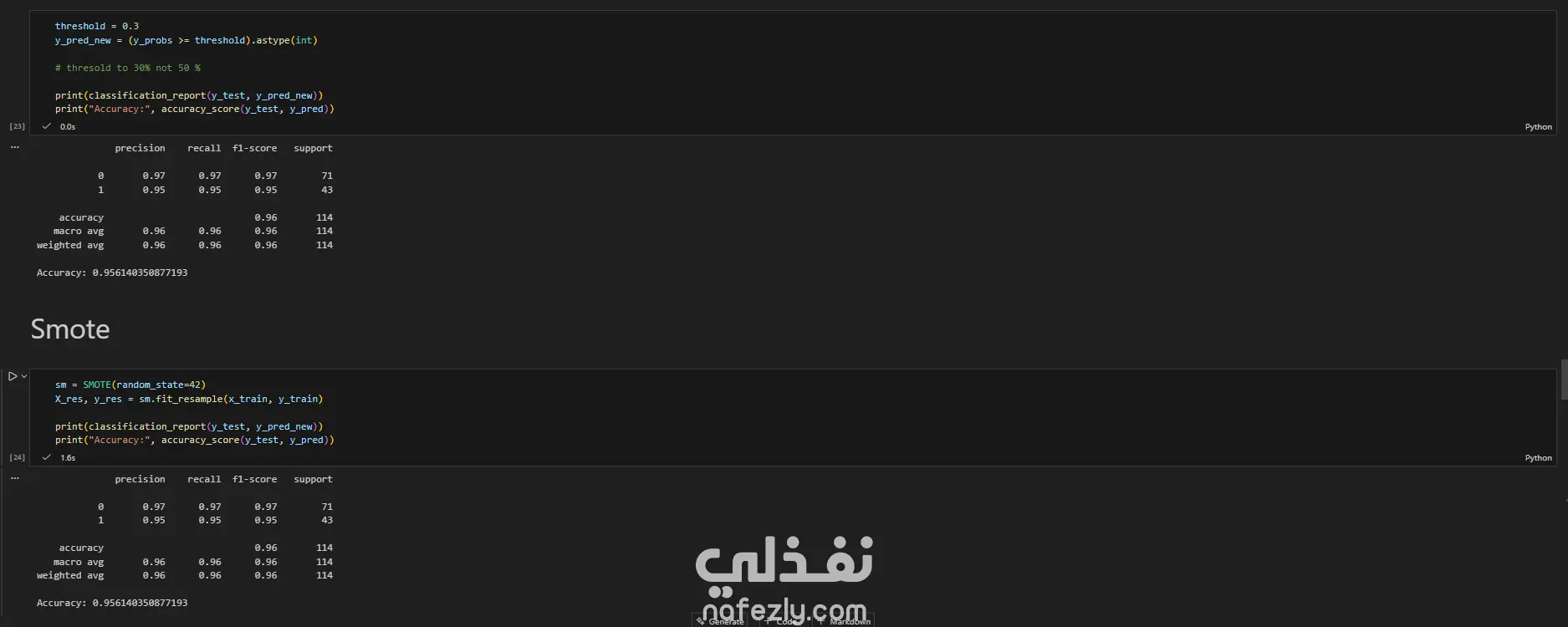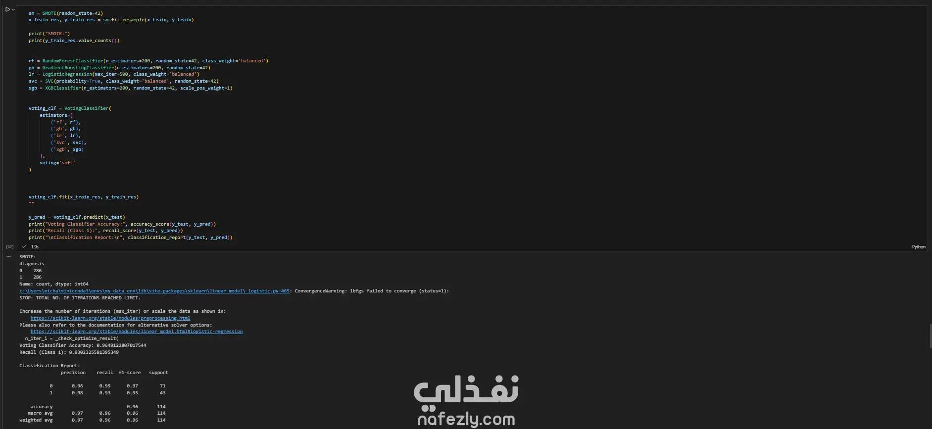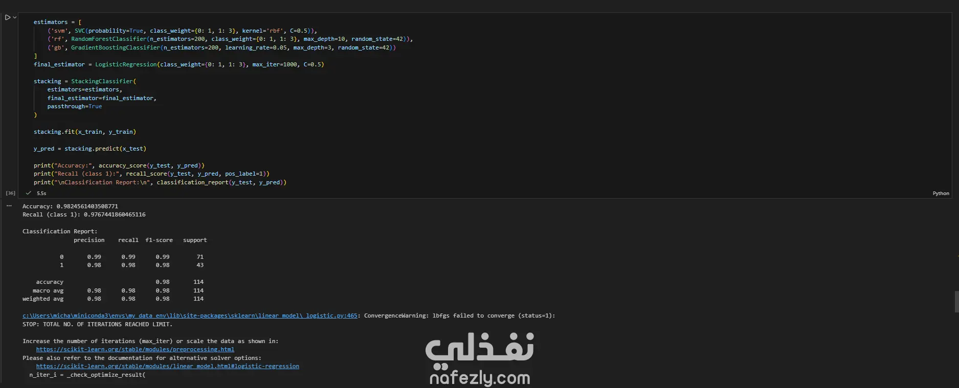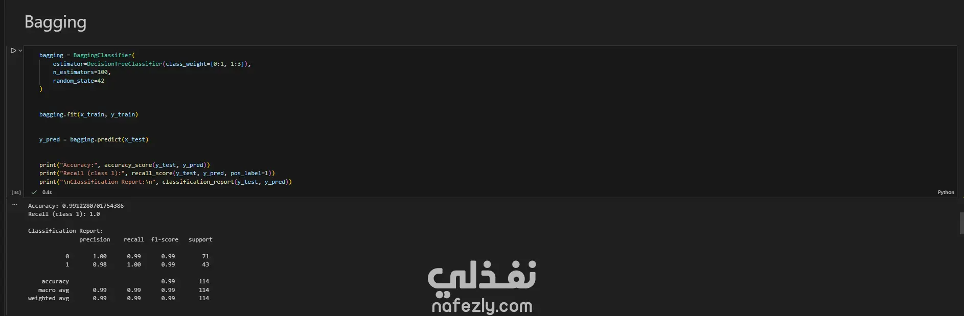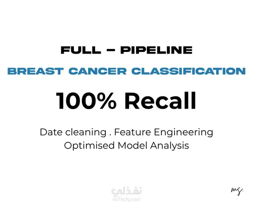 يهدف هذا المشروع إلى بناء وتدريب نماذج تعلم آلي متعددة لتصنيف أورام سرطان الثدي (خبيثة أو حميدة) بدقة عالية، باستخدام مجموعة بيانات سرطان الثدي (WBC) المعروفة. الخطوات بالتفصيل: تحضير البيانات (Data Preprocessing): بدأ العمل بتحميل البيانات وفهم طبيعتها وخصائصها الإحصائية. تم تنظيف البيانات عبر حذف الأعمدة غير الضرورية (مثل id) والأعمدة التي تحتوي على قيم فارغة بالكامل (Unnamed: 32). تم تحويل المتغير المستهدف (Diagnosis) من قيم نصية (M و B) إلى قيم رقمية (1 و 0) باستخدام LabelEncoder لتهيئة البيانات للنماذج. التحليل الاستكشافي (EDA): تم إنشاء رسوم بيانية (Histograms) لجميع المتغيرات لفهم توزيعها وخصائصها (الخلية 47). تقسيم البيانات والتدريب الأولي: تم تقسيم البيانات إلى 80% للتدريب و 20% للاختبار (train_test_split) مع تحديد random_state لضمان إمكانية تكرار النتائج. تم تدريب نموذج أساسي (Baseline) باستخدام الانحدار اللوجستي (Logistic Regression)، والذي حقق دقة 95.6% ومعدل استدعاء 90.7% (الخلايا 16-20). تطبيق وتقييم النماذج (Modeling & Evaluation): تم تجربة مجموعة واسعة من خوارزميات التصنيف لضمان الوصول لأفضل أداء ممكن، وشملت: K-Nearest Neighbors (KNN) (الخلية 25) Support Vector Machine (SVC) مع RBF Kernel (الخلية 30) Gaussian Naive Bayes (الخلية 31) شجرة القرار (Decision Tree) (الخلية 32) الغابات العشوائية (Random Forest) (الخلية 33) التقنيات المتقدمة (Advanced Techniques): نماذج التجميع (Ensemble Methods): تم تطبيق تقنيات متقدمة مثل Bagging Classifier (الخلية 34)، AdaBoost (الخلية 35)، Stacking Classifier (الخلية 36)، و Voting Classifier (بالدمج مع XGBoost) (الخلية 37). معالجة عدم التوازن (Imbalance Handling): تم استخدام تقنية SMOTE لزيادة عينات الفئة الأقل (الأورام الخبيثة) في بيانات التدريب (الخلية 37)، بالإضافة لاستخدام class_weight في النماذج (مثل SVC و RF) لضمان عدم تحيز النموذج. هندسة الميزات (Feature Engineering): تم تطبيق StandardScaler لتوحيد مقياس البيانات، ثم استخدام تحليل المكونات الرئيسية (PCA) لتقليل الأبعاد إلى 10 مكونات رئيسية وتدريب نموذج عليها (الخلية 38). تحسين الأداء (Hyperparameter Tuning): تم استخدام GridSearchCV و RandomizedSearchCV للبحث عن أفضل المعاملات، مع التركيز على مقياس "Recall" كونه الأهم في التشخيص الطبي (الخلايا 39-40). النتائج وأفضل أداء: في مهام التشخيص الطبي، يعتبر مقياس الاستدعاء (Recall) هو الأهم لضمان اكتشاف جميع الحالات الإيجابية (الأورام الخبيثة) وتقليل النتائج السلبية الكاذبة (False Negatives). أفضل أداء شامل (Overall): حقق نموذج Bagging Classifier (الموجود في الخلية 34) أفضل توازن وأعلى أداء، حيث وصل إلى: دقة (Accuracy): 99.1% استدعاء (Recall): 100% (نجح النموذج في اكتشاف جميع الحالات الخبيثة في مجموعة الاختبار). أداء متميز آخر: نموذج KNN مع ضبط العتبة (Threshold Tuning) (الخلية 29) حقق أيضاً استدعاء 100% (مع دقة 95.6%). أفضل أداء متوازن: نماذج Stacking Classifier، PCA + Logistic Regression، و Tuned Logistic Regression حققت جميعها أداءً ممتازاً ومتوازناً بدقة 98.2% واستدعاء 97.7%.