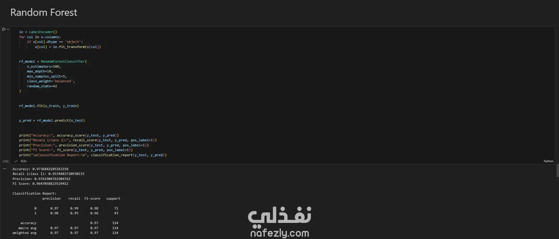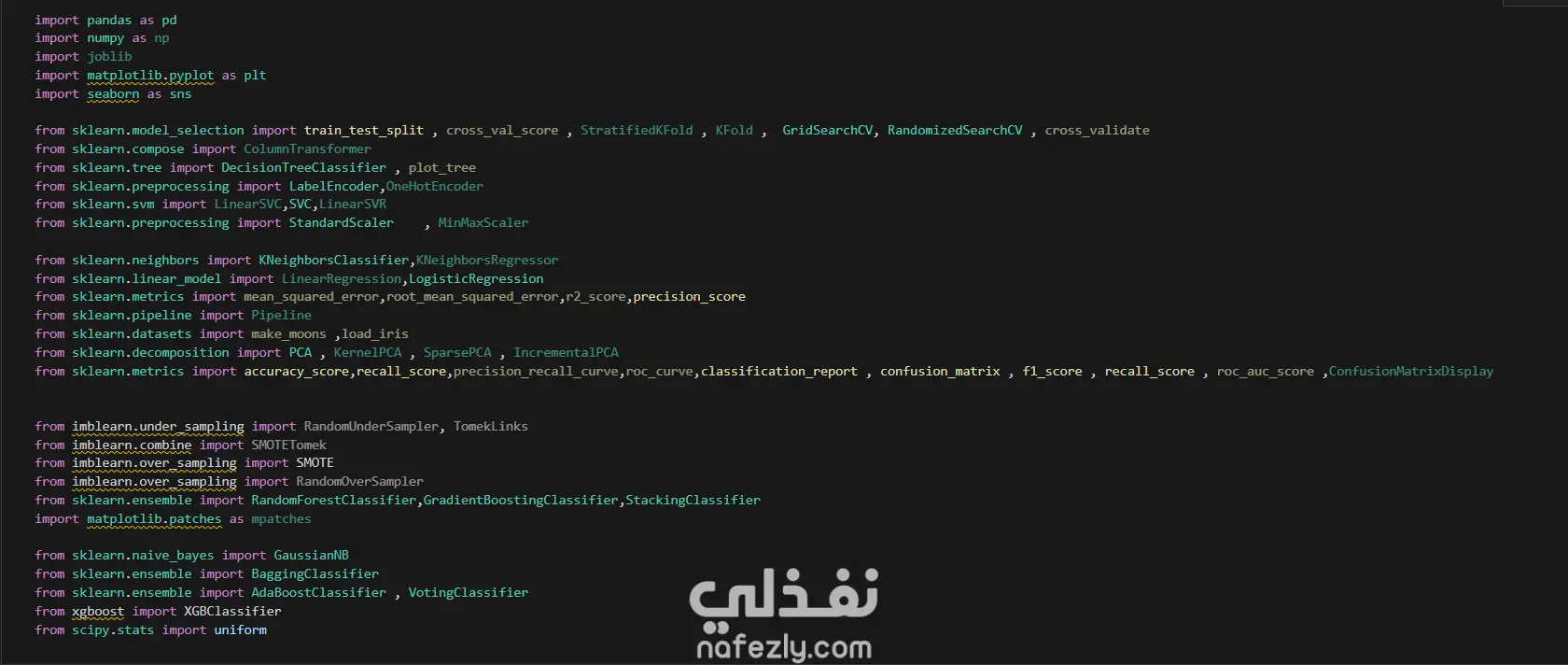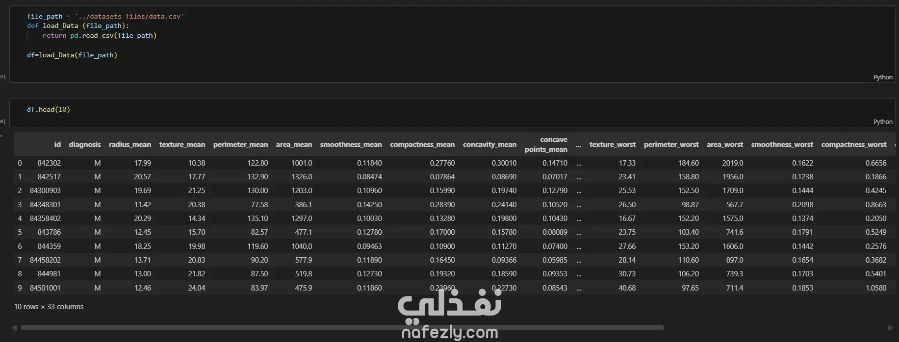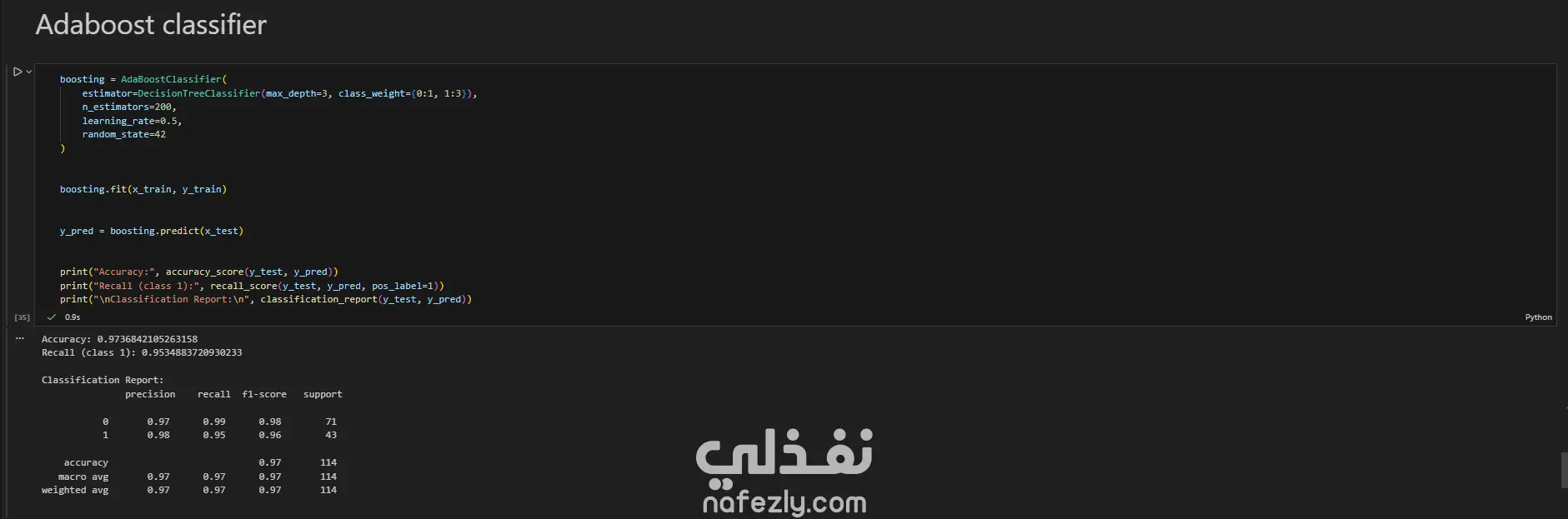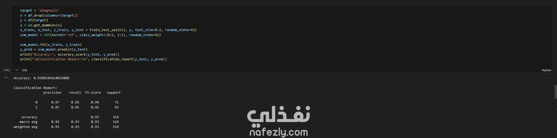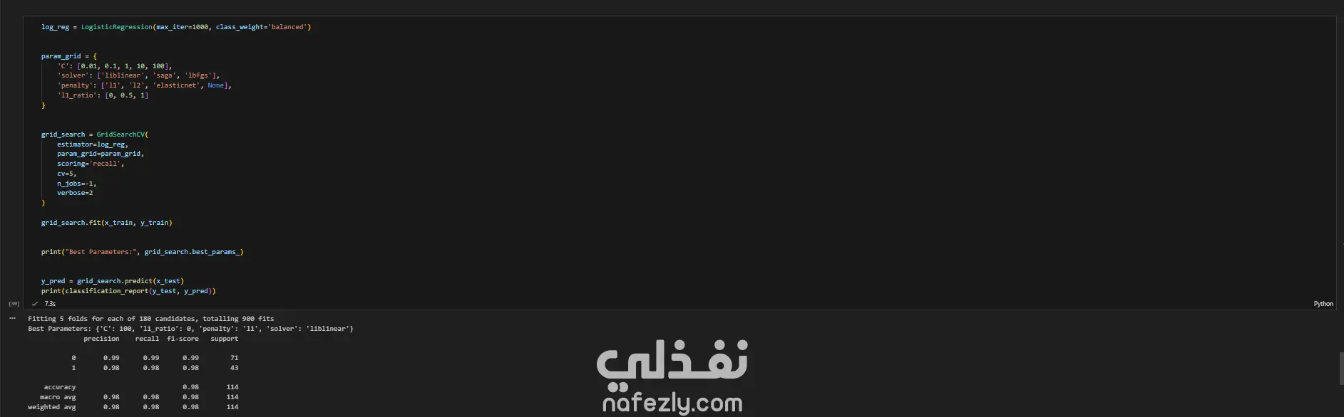 يهدف هذا المشروع إلى بناء وتدريب نماذج تعلم آلي متعددة لتصنيف أورام سرطان الثدي (خبيثة أو حميدة) بدقة عالية، باستخدام مجموعة بيانات سرطان الثدي (WBC) المعروفة. الخطوات بالتفصيل: تحضير البيانات (Data Preprocessing): بدأ العمل بتحميل البيانات وفهم طبيعتها وخصائصها الإحصائية. تم تنظيف البيانات عبر حذف الأعمدة غير الضرورية (مثل id) والأعمدة التي تحتوي على قيم فارغة بالكامل (Unnamed: 32). تم تحويل المتغير المستهدف (Diagnosis) من قيم نصية (M و B) إلى قيم رقمية (1 و 0) باستخدام LabelEncoder لتهيئة البيانات للنماذج. التحليل الاستكشافي (EDA): تم إنشاء رسوم بيانية (Histograms) لجميع المتغيرات لفهم توزيعها وخصائصها (الخلية 47). تقسيم البيانات والتدريب الأولي: تم تقسيم البيانات إلى 80% للتدريب و 20% للاختبار (train_test_split) مع تحديد random_state لضمان إمكانية تكرار النتائج. تم تدريب نموذج أساسي (Baseline) باستخدام الانحدار اللوجستي (Logistic Regression)، والذي حقق دقة 95.6% ومعدل استدعاء 90.7% (الخلايا 16-20). تطبيق وتقييم النماذج (Modeling & Evaluation): تم تجربة مجموعة واسعة من خوارزميات التصنيف لضمان الوصول لأفضل أداء ممكن، وشملت: K-Nearest Neighbors (KNN) (الخلية 25) Support Vector Machine (SVC) مع RBF Kernel (الخلية 30) Gaussian Naive Bayes (الخلية 31) شجرة القرار (Decision Tree) (الخلية 32) الغابات العشوائية (Random Forest) (الخلية 33) التقنيات المتقدمة (Advanced Techniques): نماذج التجميع (Ensemble Methods): تم تطبيق تقنيات متقدمة مثل Bagging Classifier (الخلية 34)، AdaBoost (الخلية 35)، Stacking Classifier (الخلية 36)، و Voting Classifier (بالدمج مع XGBoost) (الخلية 37). معالجة عدم التوازن (Imbalance Handling): تم استخدام تقنية SMOTE لزيادة عينات الفئة الأقل (الأورام الخبيثة) في بيانات التدريب (الخلية 37)، بالإضافة لاستخدام class_weight في النماذج (مثل SVC و RF) لضمان عدم تحيز النموذج. هندسة الميزات (Feature Engineering): تم تطبيق StandardScaler لتوحيد مقياس البيانات، ثم استخدام تحليل المكونات الرئيسية (PCA) لتقليل الأبعاد إلى 10 مكونات رئيسية وتدريب نموذج عليها (الخلية 38). تحسين الأداء (Hyperparameter Tuning): تم استخدام GridSearchCV و RandomizedSearchCV للبحث عن أفضل المعاملات، مع التركيز على مقياس "Recall" كونه الأهم في التشخيص الطبي (الخلايا 39-40). النتائج وأفضل أداء: في مهام التشخيص الطبي، يعتبر مقياس الاستدعاء (Recall) هو الأهم لضمان اكتشاف جميع الحالات الإيجابية (الأورام الخبيثة) وتقليل النتائج السلبية الكاذبة (False Negatives). أفضل أداء شامل (Overall): حقق نموذج Bagging Classifier (الموجود في الخلية 34) أفضل توازن وأعلى أداء، حيث وصل إلى: دقة (Accuracy): 99.1% استدعاء (Recall): 100% (نجح النموذج في اكتشاف جميع الحالات الخبيثة في مجموعة الاختبار). أداء متميز آخر: نموذج KNN مع ضبط العتبة (Threshold Tuning) (الخلية 29) حقق أيضاً استدعاء 100% (مع دقة 95.6%). أفضل أداء متوازن: نماذج Stacking Classifier، PCA + Logistic Regression، و Tuned Logistic Regression حققت جميعها أداءً ممتازاً ومتوازناً بدقة 98.2% واستدعاء 97.7%.