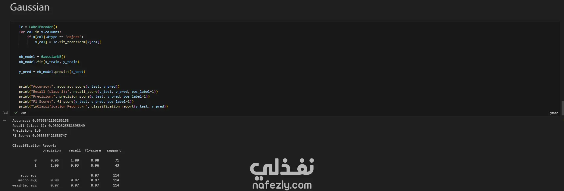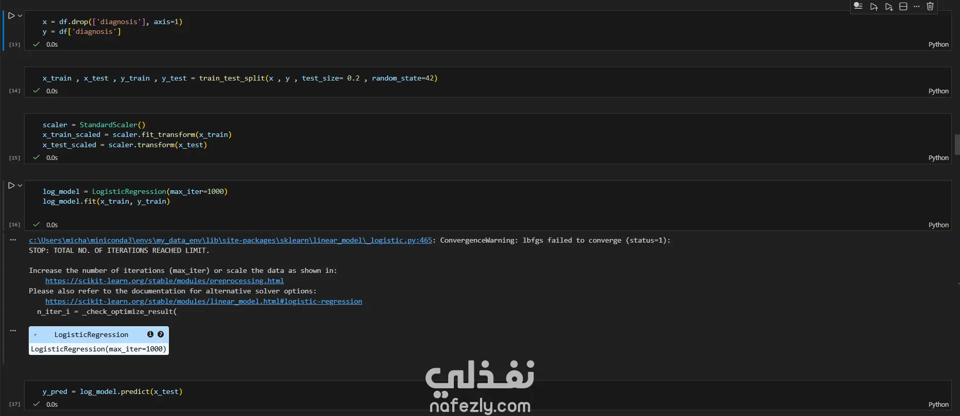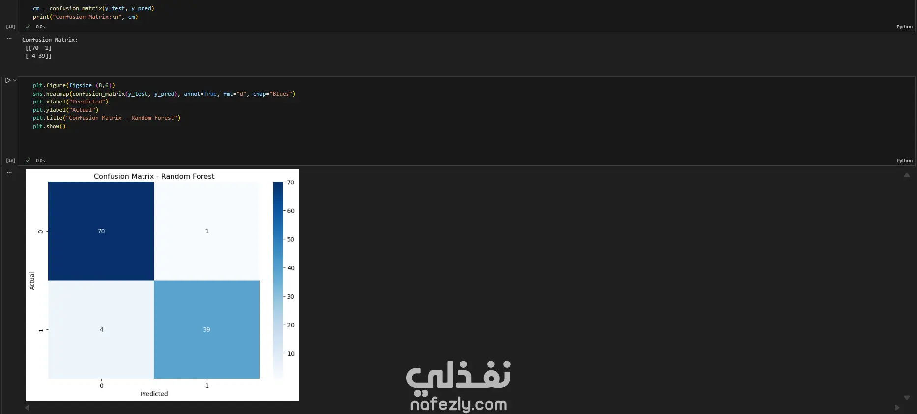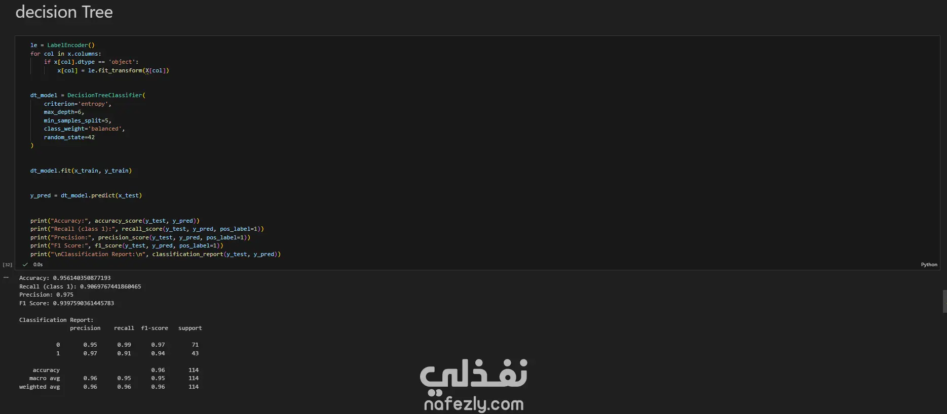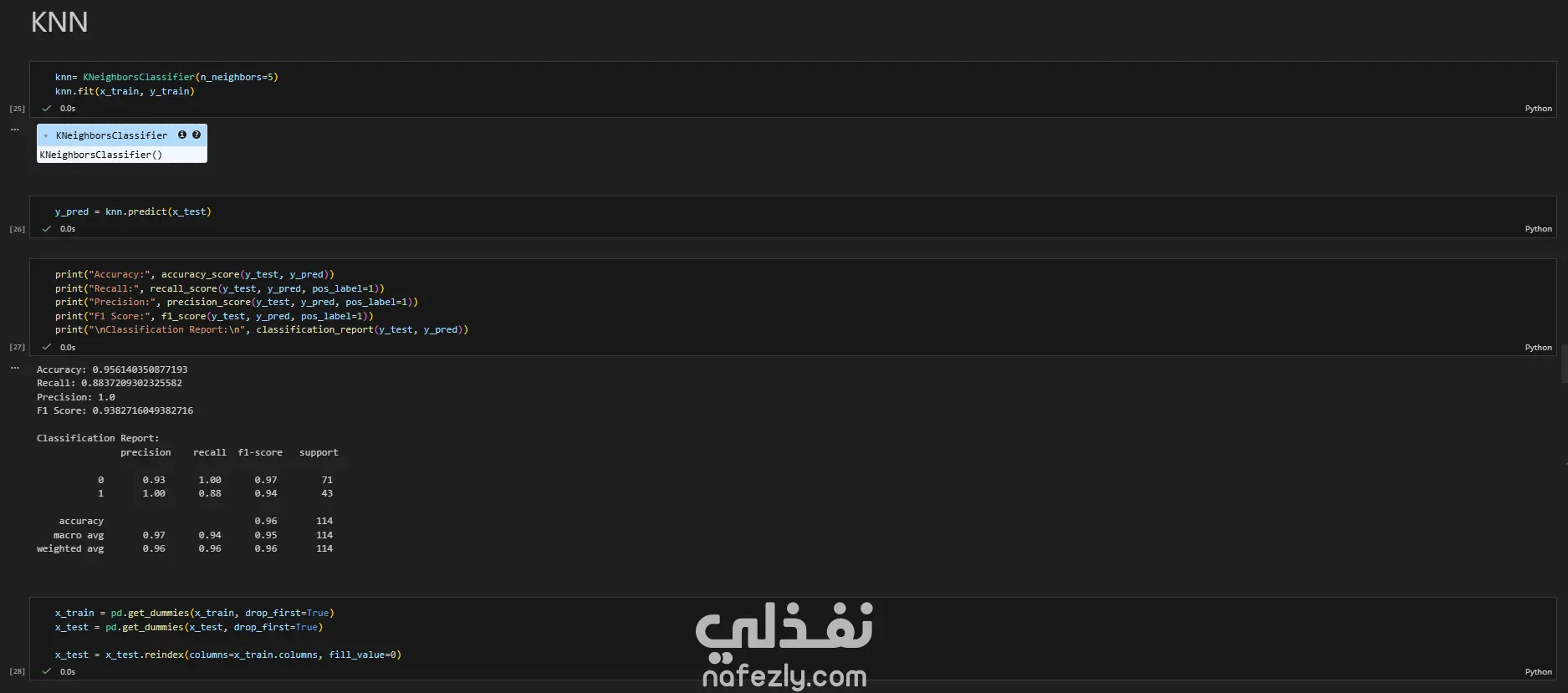 يهدف هذا المشروع إلى بناء وتدريب نماذج تعلم آلي متعددة لتصنيف أورام سرطان الثدي (خبيثة أو حميدة) بدقة عالية، باستخدام مجموعة بيانات سرطان الثدي (WBC) المعروفة. الخطوات بالتفصيل: تحضير البيانات (Data Preprocessing): بدأ العمل بتحميل البيانات وفهم طبيعتها وخصائصها الإحصائية. تم تنظيف البيانات عبر حذف الأعمدة غير الضرورية (مثل id) والأعمدة التي تحتوي على قيم فارغة بالكامل (Unnamed: 32). تم تحويل المتغير المستهدف (Diagnosis) من قيم نصية (M و B) إلى قيم رقمية (1 و 0) باستخدام LabelEncoder لتهيئة البيانات للنماذج. التحليل الاستكشافي (EDA): تم إنشاء رسوم بيانية (Histograms) لجميع المتغيرات لفهم توزيعها وخصائصها (الخلية 47). تقسيم البيانات والتدريب الأولي: تم تقسيم البيانات إلى 80% للتدريب و 20% للاختبار (train_test_split) مع تحديد random_state لضمان إمكانية تكرار النتائج. تم تدريب نموذج أساسي (Baseline) باستخدام الانحدار اللوجستي (Logistic Regression)، والذي حقق دقة 95.6% ومعدل استدعاء 90.7% (الخلايا 16-20). تطبيق وتقييم النماذج (Modeling & Evaluation): تم تجربة مجموعة واسعة من خوارزميات التصنيف لضمان الوصول لأفضل أداء ممكن، وشملت: K-Nearest Neighbors (KNN) (الخلية 25) Support Vector Machine (SVC) مع RBF Kernel (الخلية 30) Gaussian Naive Bayes (الخلية 31) شجرة القرار (Decision Tree) (الخلية 32) الغابات العشوائية (Random Forest) (الخلية 33) التقنيات المتقدمة (Advanced Techniques): نماذج التجميع (Ensemble Methods): تم تطبيق تقنيات متقدمة مثل Bagging Classifier (الخلية 34)، AdaBoost (الخلية 35)، Stacking Classifier (الخلية 36)، و Voting Classifier (بالدمج مع XGBoost) (الخلية 37). معالجة عدم التوازن (Imbalance Handling): تم استخدام تقنية SMOTE لزيادة عينات الفئة الأقل (الأورام الخبيثة) في بيانات التدريب (الخلية 37)، بالإضافة لاستخدام class_weight في النماذج (مثل SVC و RF) لضمان عدم تحيز النموذج. هندسة الميزات (Feature Engineering): تم تطبيق StandardScaler لتوحيد مقياس البيانات، ثم استخدام تحليل المكونات الرئيسية (PCA) لتقليل الأبعاد إلى 10 مكونات رئيسية وتدريب نموذج عليها (الخلية 38). تحسين الأداء (Hyperparameter Tuning): تم استخدام GridSearchCV و RandomizedSearchCV للبحث عن أفضل المعاملات، مع التركيز على مقياس "Recall" كونه الأهم في التشخيص الطبي (الخلايا 39-40). النتائج وأفضل أداء: في مهام التشخيص الطبي، يعتبر مقياس الاستدعاء (Recall) هو الأهم لضمان اكتشاف جميع الحالات الإيجابية (الأورام الخبيثة) وتقليل النتائج السلبية الكاذبة (False Negatives). أفضل أداء شامل (Overall): حقق نموذج Bagging Classifier (الموجود في الخلية 34) أفضل توازن وأعلى أداء، حيث وصل إلى: دقة (Accuracy): 99.1% استدعاء (Recall): 100% (نجح النموذج في اكتشاف جميع الحالات الخبيثة في مجموعة الاختبار). أداء متميز آخر: نموذج KNN مع ضبط العتبة (Threshold Tuning) (الخلية 29) حقق أيضاً استدعاء 100% (مع دقة 95.6%). أفضل أداء متوازن: نماذج Stacking Classifier، PCA + Logistic Regression، و Tuned Logistic Regression حققت جميعها أداءً ممتازاً ومتوازناً بدقة 98.2% واستدعاء 97.7%.