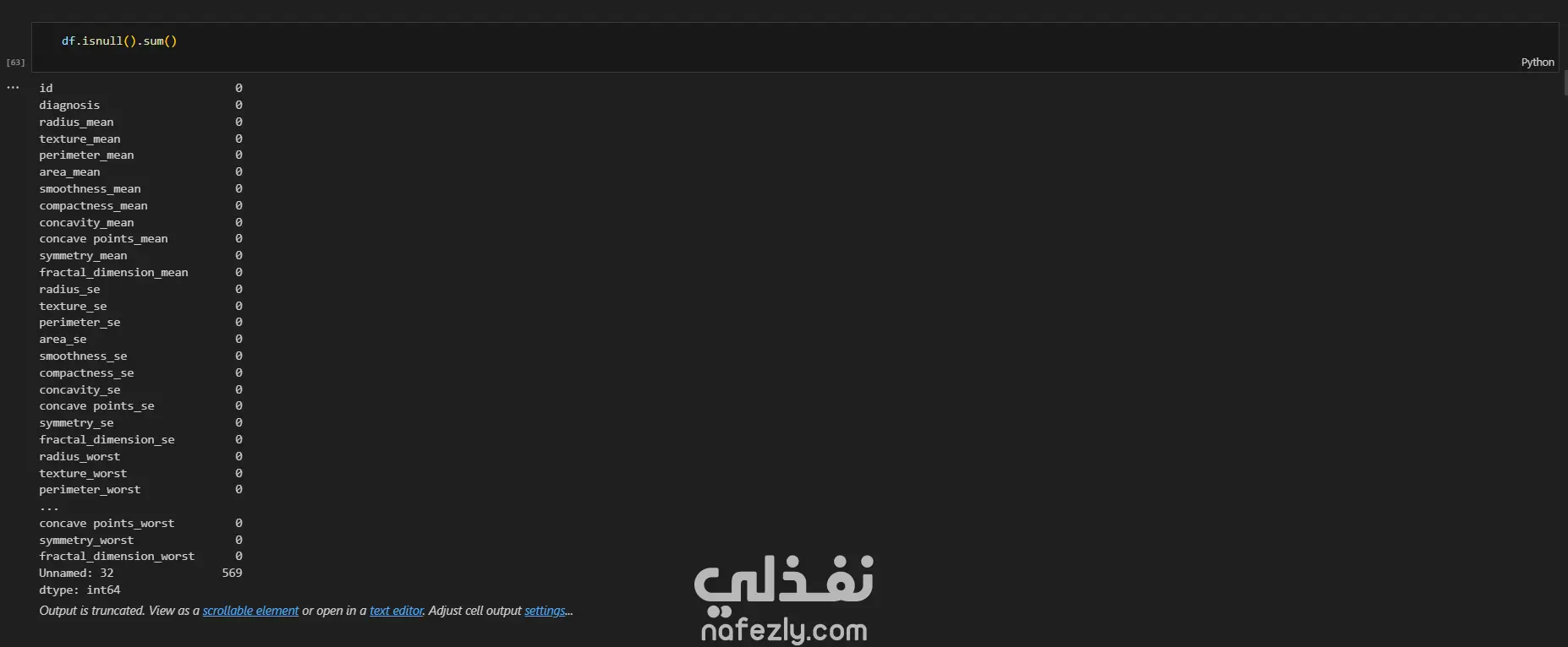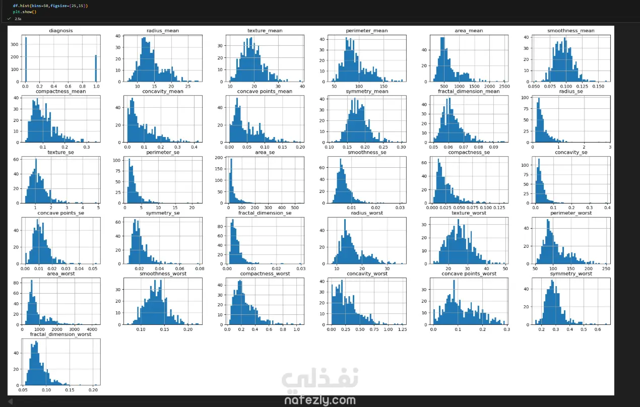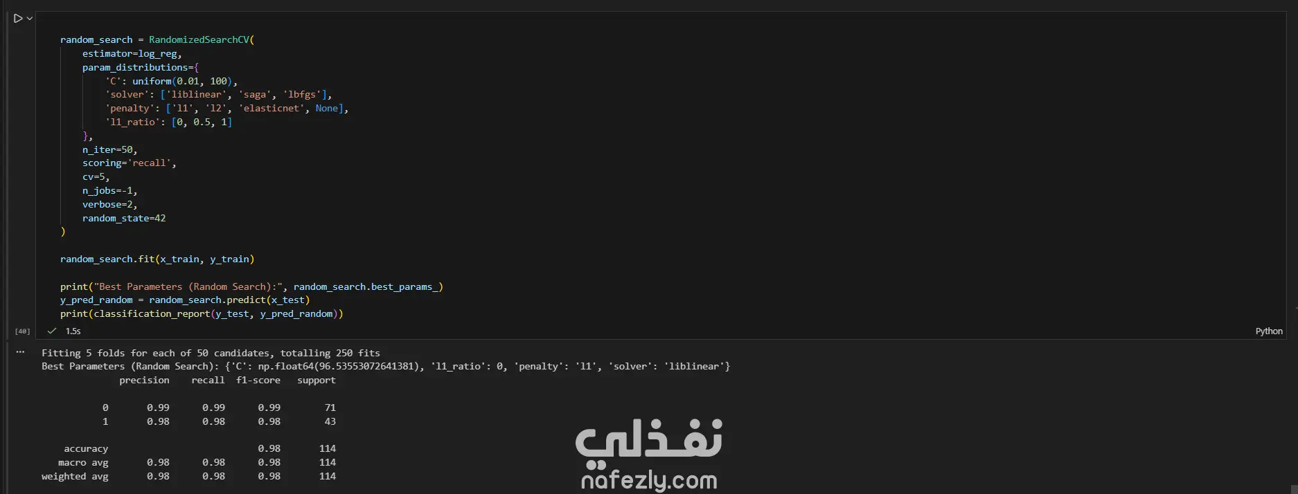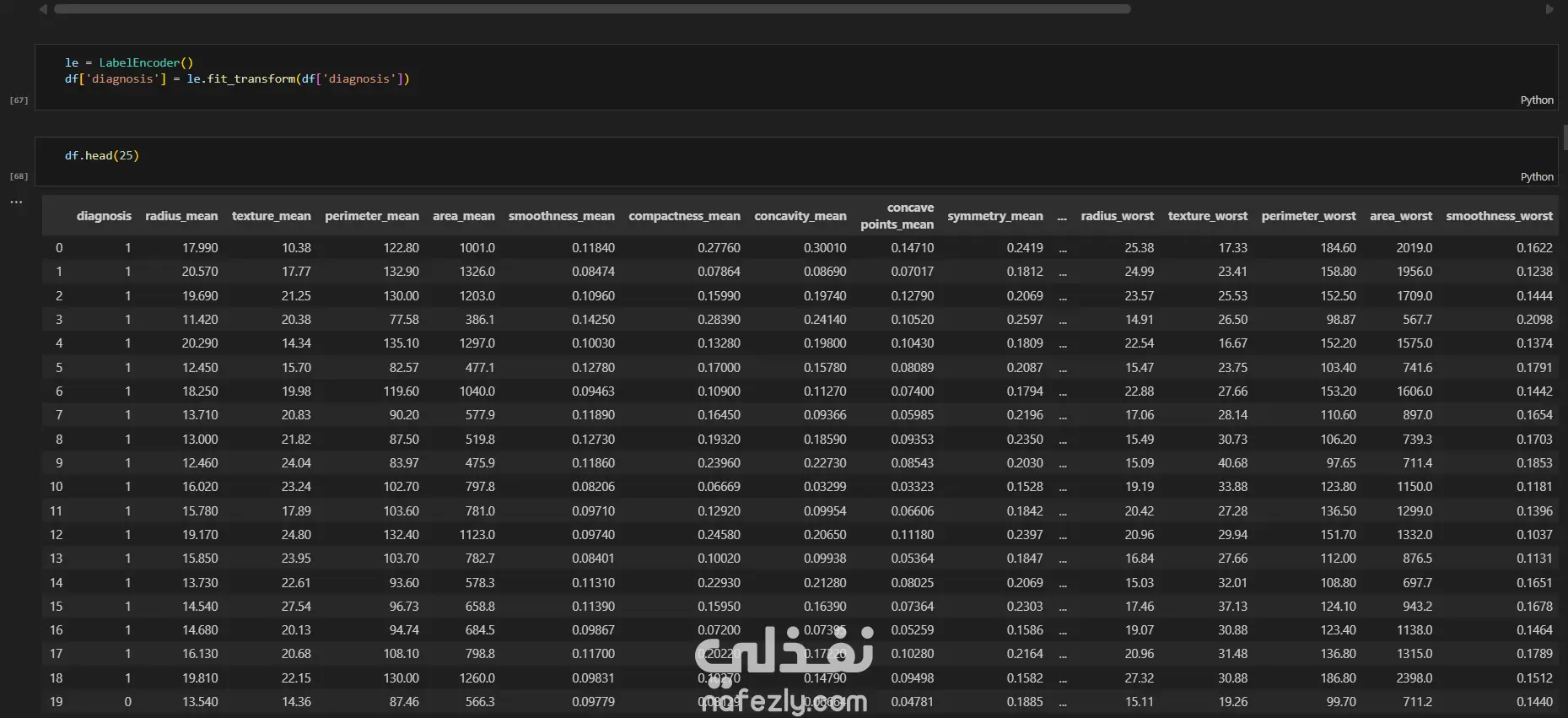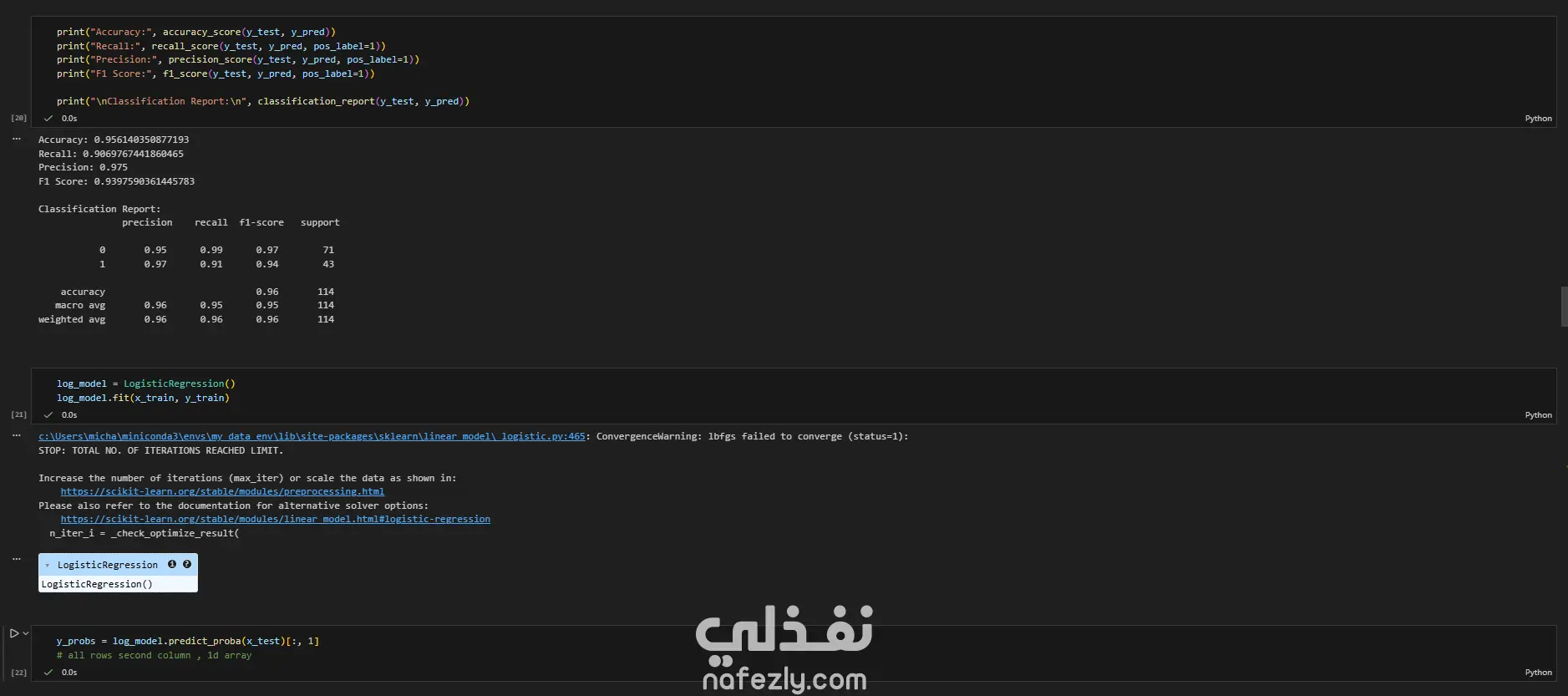 يهدف هذا المشروع إلى بناء وتدريب نماذج تعلم آلي متعددة لتصنيف أورام سرطان الثدي (خبيثة أو حميدة) بدقة عالية، باستخدام مجموعة بيانات سرطان الثدي (WBC) المعروفة. الخطوات بالتفصيل: تحضير البيانات (Data Preprocessing): بدأ العمل بتحميل البيانات وفهم طبيعتها وخصائصها الإحصائية. تم تنظيف البيانات عبر حذف الأعمدة غير الضرورية (مثل id) والأعمدة التي تحتوي على قيم فارغة بالكامل (Unnamed: 32). تم تحويل المتغير المستهدف (Diagnosis) من قيم نصية (M و B) إلى قيم رقمية (1 و 0) باستخدام LabelEncoder لتهيئة البيانات للنماذج. التحليل الاستكشافي (EDA): تم إنشاء رسوم بيانية (Histograms) لجميع المتغيرات لفهم توزيعها وخصائصها (الخلية 47). تقسيم البيانات والتدريب الأولي: تم تقسيم البيانات إلى 80% للتدريب و 20% للاختبار (train_test_split) مع تحديد random_state لضمان إمكانية تكرار النتائج. تم تدريب نموذج أساسي (Baseline) باستخدام الانحدار اللوجستي (Logistic Regression)، والذي حقق دقة 95.6% ومعدل استدعاء 90.7% (الخلايا 16-20). تطبيق وتقييم النماذج (Modeling & Evaluation): تم تجربة مجموعة واسعة من خوارزميات التصنيف لضمان الوصول لأفضل أداء ممكن، وشملت: K-Nearest Neighbors (KNN) (الخلية 25) Support Vector Machine (SVC) مع RBF Kernel (الخلية 30) Gaussian Naive Bayes (الخلية 31) شجرة القرار (Decision Tree) (الخلية 32) الغابات العشوائية (Random Forest) (الخلية 33) التقنيات المتقدمة (Advanced Techniques): نماذج التجميع (Ensemble Methods): تم تطبيق تقنيات متقدمة مثل Bagging Classifier (الخلية 34)، AdaBoost (الخلية 35)، Stacking Classifier (الخلية 36)، و Voting Classifier (بالدمج مع XGBoost) (الخلية 37). معالجة عدم التوازن (Imbalance Handling): تم استخدام تقنية SMOTE لزيادة عينات الفئة الأقل (الأورام الخبيثة) في بيانات التدريب (الخلية 37)، بالإضافة لاستخدام class_weight في النماذج (مثل SVC و RF) لضمان عدم تحيز النموذج. هندسة الميزات (Feature Engineering): تم تطبيق StandardScaler لتوحيد مقياس البيانات، ثم استخدام تحليل المكونات الرئيسية (PCA) لتقليل الأبعاد إلى 10 مكونات رئيسية وتدريب نموذج عليها (الخلية 38). تحسين الأداء (Hyperparameter Tuning): تم استخدام GridSearchCV و RandomizedSearchCV للبحث عن أفضل المعاملات، مع التركيز على مقياس "Recall" كونه الأهم في التشخيص الطبي (الخلايا 39-40). النتائج وأفضل أداء: في مهام التشخيص الطبي، يعتبر مقياس الاستدعاء (Recall) هو الأهم لضمان اكتشاف جميع الحالات الإيجابية (الأورام الخبيثة) وتقليل النتائج السلبية الكاذبة (False Negatives). أفضل أداء شامل (Overall): حقق نموذج Bagging Classifier (الموجود في الخلية 34) أفضل توازن وأعلى أداء، حيث وصل إلى: دقة (Accuracy): 99.1% استدعاء (Recall): 100% (نجح النموذج في اكتشاف جميع الحالات الخبيثة في مجموعة الاختبار). أداء متميز آخر: نموذج KNN مع ضبط العتبة (Threshold Tuning) (الخلية 29) حقق أيضاً استدعاء 100% (مع دقة 95.6%). أفضل أداء متوازن: نماذج Stacking Classifier، PCA + Logistic Regression، و Tuned Logistic Regression حققت جميعها أداءً ممتازاً ومتوازناً بدقة 98.2% واستدعاء 97.7%.