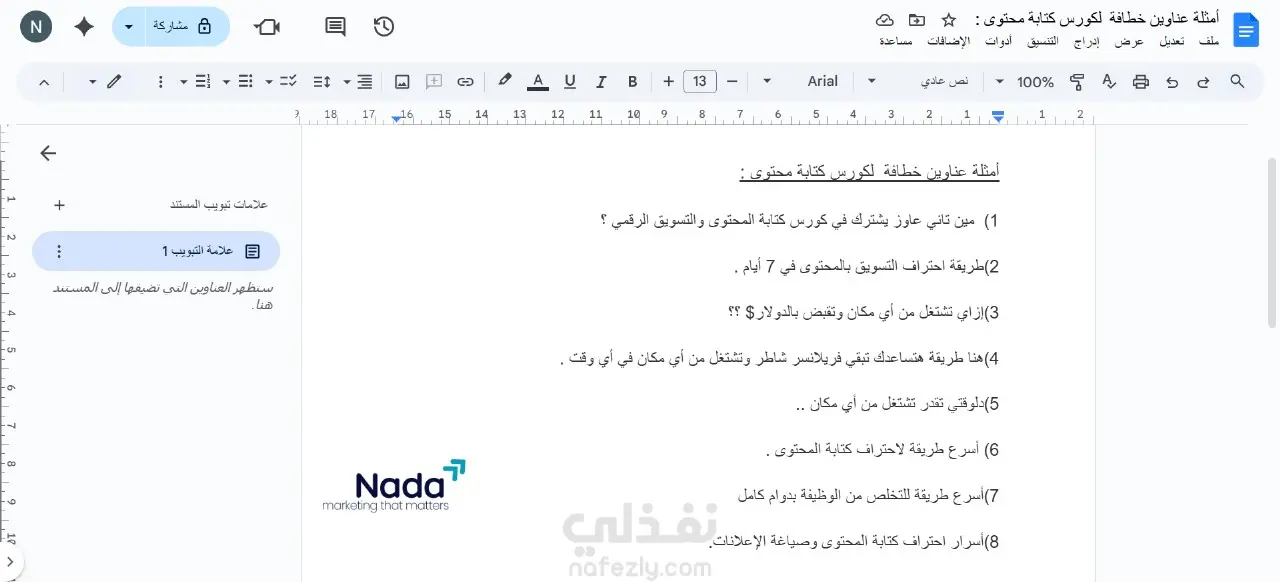 كتابة مجموعة من العناوين التسويقية القوية لكورس “كتابة المحتوى”، مع الاعتماد على تحليل الجمهور وتحديد الـ Buyer Persona لضمان أن كل عنوان يخدم هدفه ويصل مباشرة للقارئ. تم التركيز على الوضوح، السهولة، الجاذبية، وتحفيز العميل لاتخاذ خطوة (CTA).