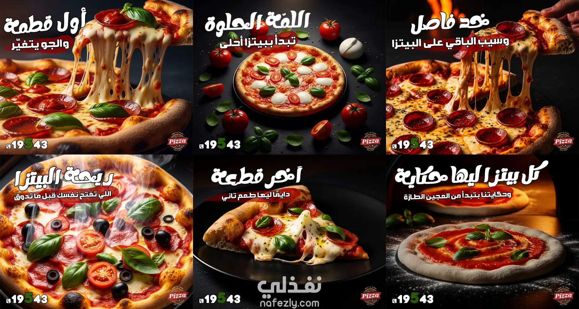 قمت بتصميم حملة إعلانية كاملة لمطعم بيتزا، شملت 6 تصاميم أساسية بتوجه بصري موحّد وأسلوب احترافي يجذب العملاء من أول نظرة.