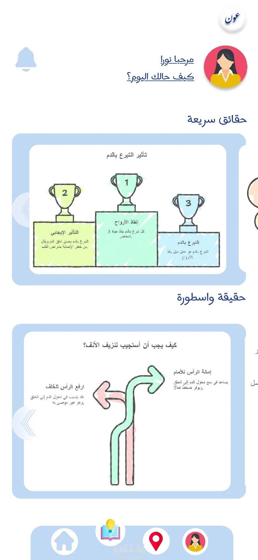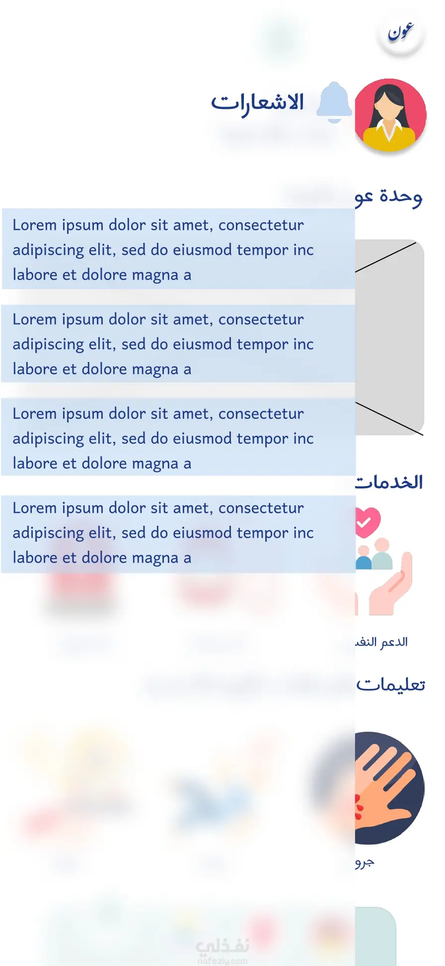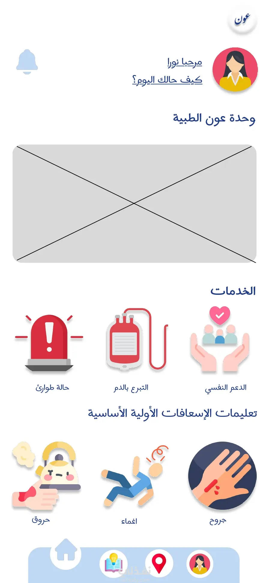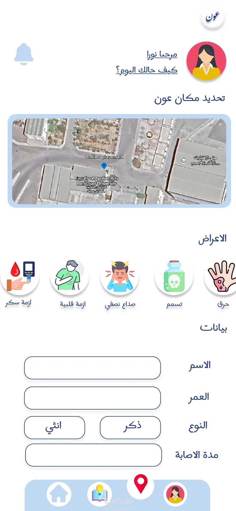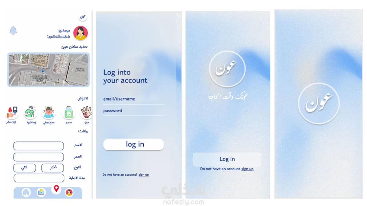 تصميم واجهة وتجربة المستخدم (UI/UX) لتطبيق 'عون'، وهو تطبيق شامل للخدمات الصحية الطارئة والإسعافات الأولية. يهدف التطبيق إلى تقديم المساعدة الفورية عن طريق تحديد موقع المستخدم بدقة على الخريطة لتسريع وصول فرق الإسعاف. وتتميز الواجهة الرئيسية بتوفير دليل سريع للأعراض الشائعة (مثل ارتفاع السكر أو الإصابات)، حيث يمكن للمستخدم إما الحصول على تعليمات إسعافات أولية موثوقة أو طلب المساعدة الطبية مباشرة. كما يتضمن التطبيق واجهات مبسطة وآمنة لتسجيل الدخول والوصول إلى بيانات المستخدم الصحية الضرورية (الاسم، العمر، النوع) التي تساعد المسعفين في تقديم العون بشكل أكثر فعالية.
