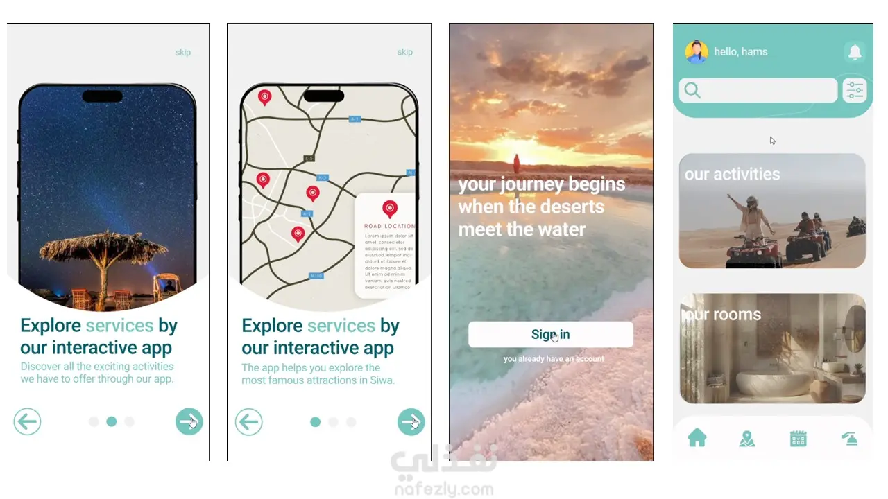 تصميم واجهة وتجربة المستخدم (UI/UX) لتطبيق فندق 'Nomadia'، المصمم خصيصاً لخدمة زوار واحة سيوة. يهدف التطبيق إلى توفير تجربة حجز سلسة للغرف الفندقية، بالإضافة إلى كونه دليلاً سياحياً تفاعلياً للمنطقة. تتضمن الشاشات التقديمية (Onboarding) استعراضاً لخدمات التطبيق وخريطة تحديد المعالم السياحية الشهيرة في سيوة. وتتميز الواجهة الرئيسية بتوفير بحث وتصفية متقدمة، وعرض بصري جذاب لخيارات حجز الغرف والأنشطة الترفيهية والمغامرات المتاحة للمستخدمين، مما يربط المستخدم بوجهته السياحية بشكل فعال