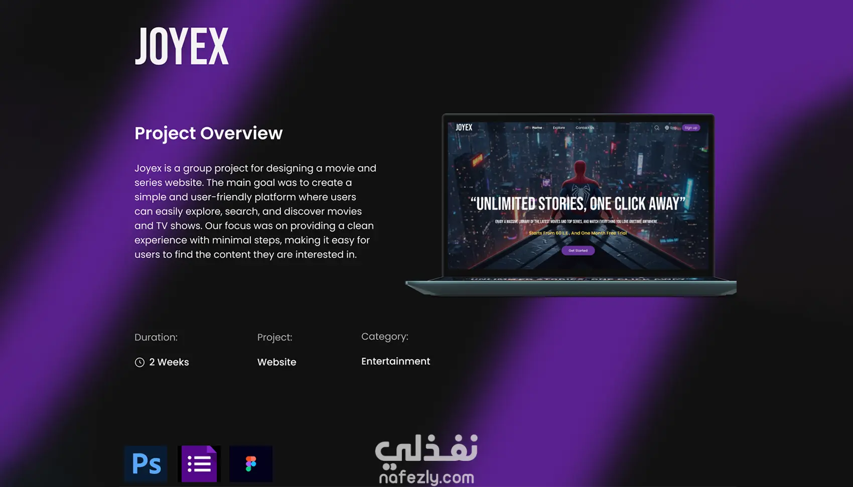 JOYEX Movie Streaming Website – UI/UX Case Study عملت على تصميم واجهة وتجربة مستخدم لموقع JOYEX، وهو مشروع جماعي يهدف إلى إنشاء منصة بث أفلام أونلاين توفر تجربة مشاهدة سلسة وممتعة. ركّزنا في التصميم على المزج بين الراحة البصرية والتفاعل السهل، مع واجهة داكنة أنيقة تعكس أجواء السينما وتدعم استكشاف المحتوى بسهولة. دوري في المشروع: تصميم واجهة المستخدم (UI Design): صممت الواجهة الرئيسية وصفحات الأفلام باستخدام لوحة ألوان داكنة بدرجات بنفسجية تعكس الطابع السينمائي، وخط Poppins لخلق مظهر عصري وواضح. النماذج الأولية (Wireframes & Prototypes): شاركت في إعداد النماذج التفاعلية لكل مراحل التجربة (صفحة التسجيل – عرض الفيلم – الدفع) مع اختبار وتحسين الواجهات بناءً على الملاحظات الجماعية. أهداف التصميم: تقديم تجربة مشاهدة رقمية تحاكي أجواء السينما. جعل التصفح واكتشاف الأفلام أكثر سهولة ومتعة. إبراز المحتوى بطريقة جذابة تركز على الصورة والتفاعل. تعزيز التعاون داخل الفريق عبر مراحل البحث، التصميم، والاختبار لضمان تجربة مستخدم متكاملة.